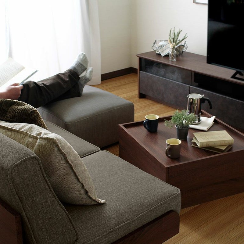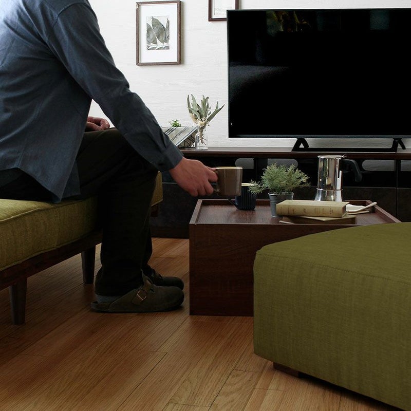 上からかぶせるだけでオットマンを収納できる、ボックス型のスクエアテーブル。