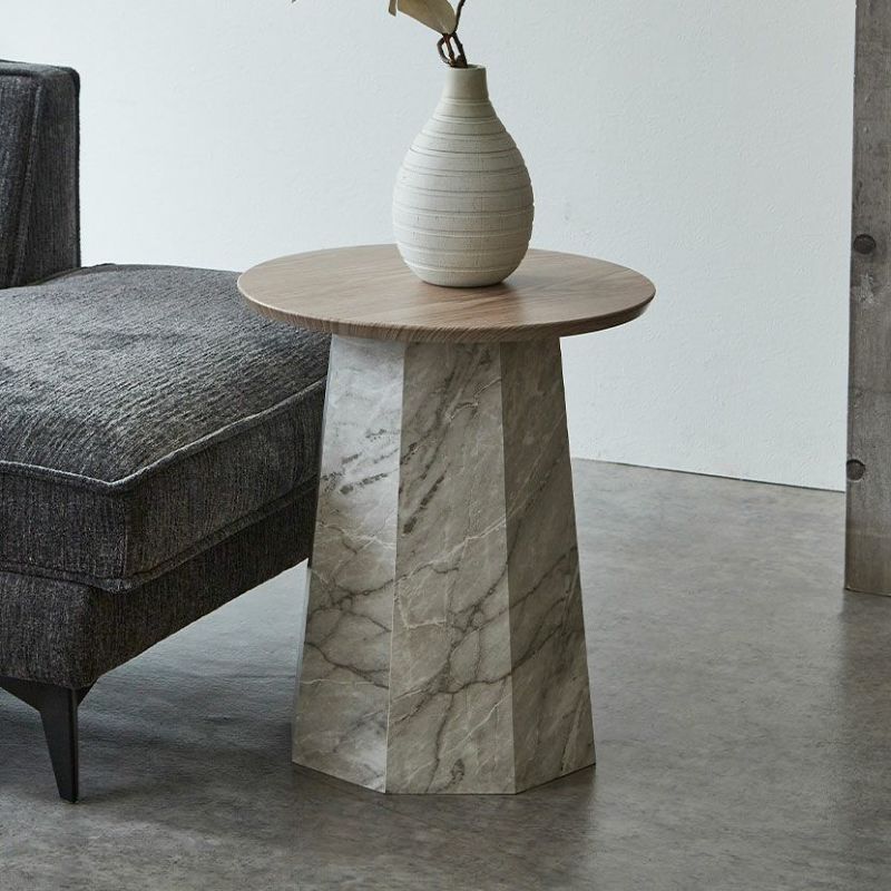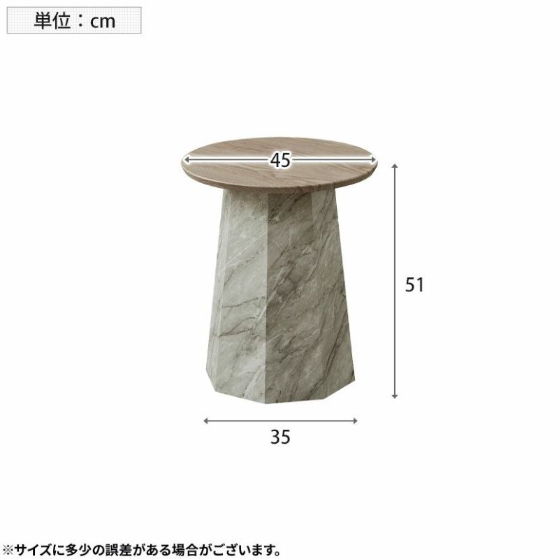 木目調の天板とマーブル柄の脚がMIXされたサイドテーブル。モニュメントのようなデザインが特徴的です。