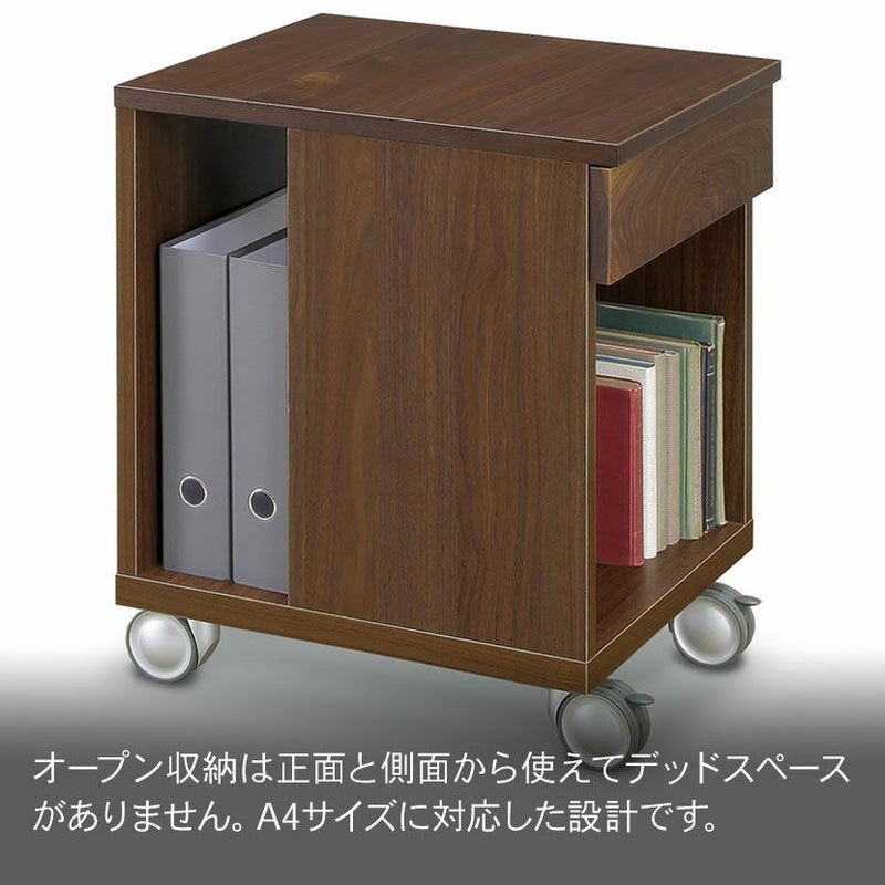 ●オープン収納は正面と側面から使えてデッドスペースがありません。A4サイズ対応設計です。