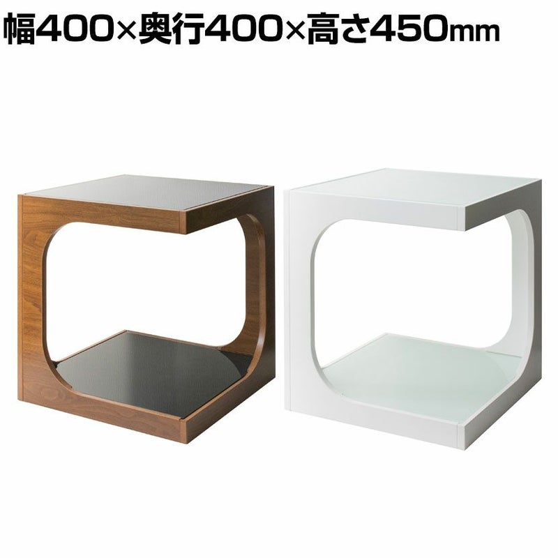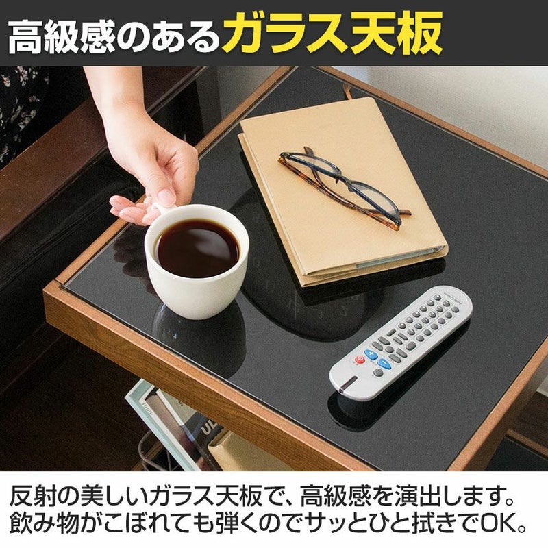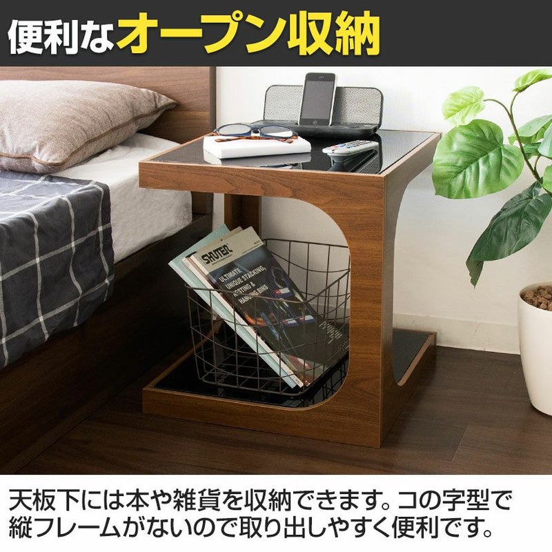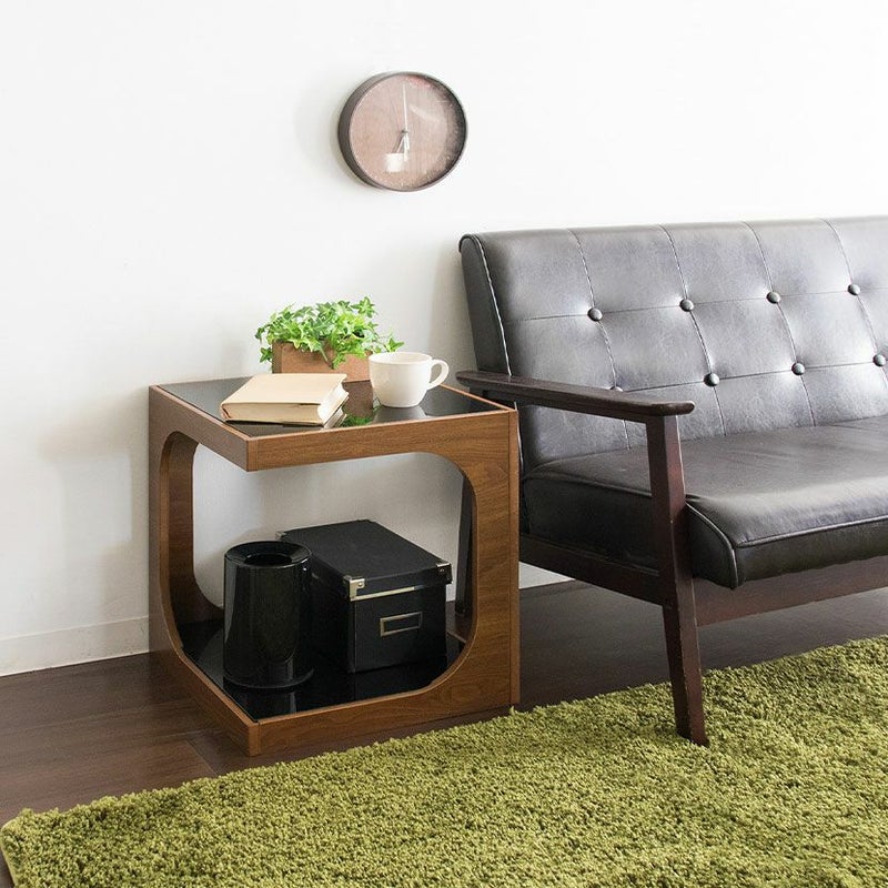 ・四角いキューブ型をくり抜いたような、スタイリッシュなガラス天板と木製フレームのサイドテーブルです。