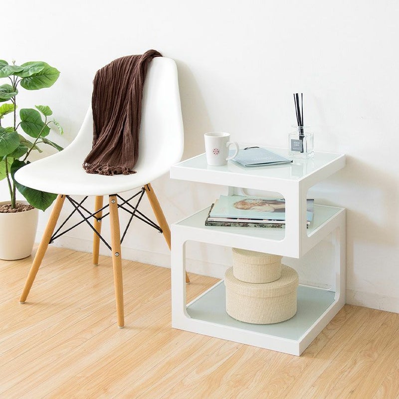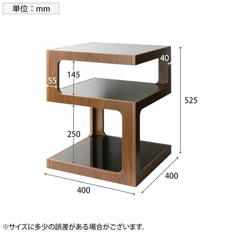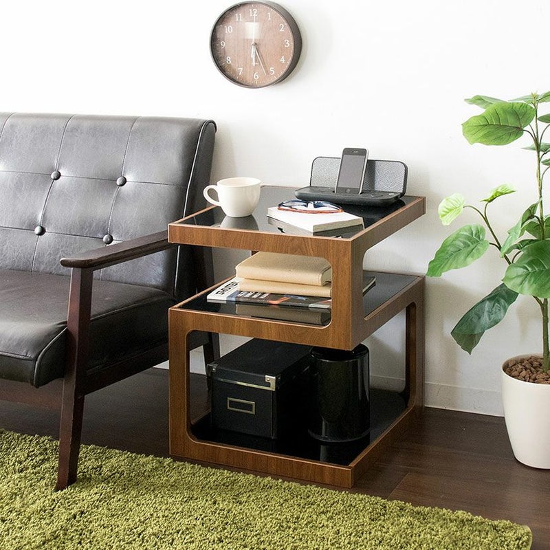 ・四角いキューブ型をくり抜いたような、スタイリッシュなガラス天板と木製フレームのサイドテーブルです。