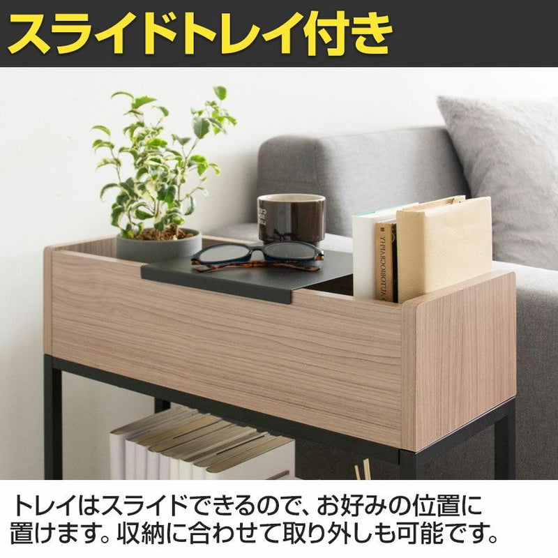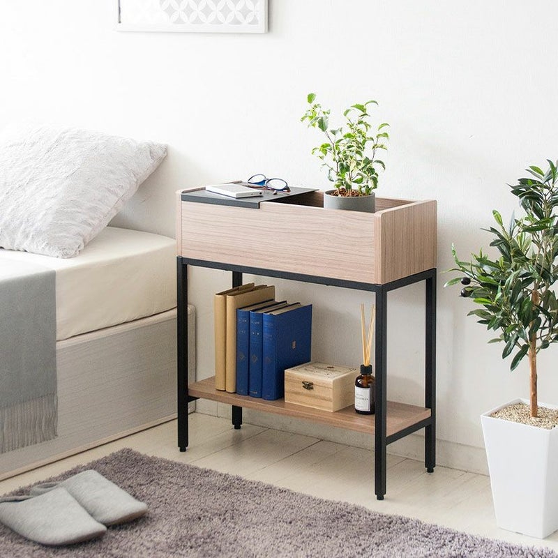 ・鉢や本が倒れないボックス状の棚と小物が置けるトレイがあり、置くものによって使い分けができます。