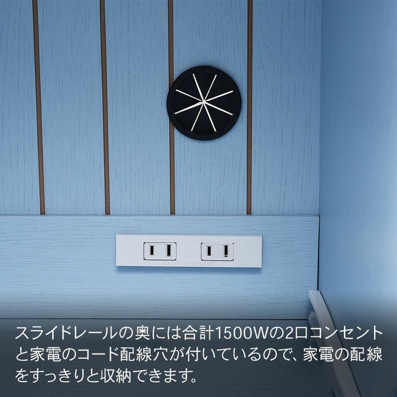 スライドレールの奥には合計1500Wの2口コンセントと家電のコード配線穴が付いているので、