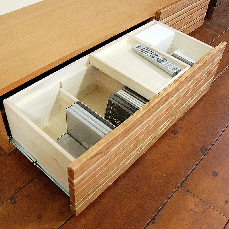 ●引き出しにはCDやDVDの収納に便利な仕切り板と、リモコンや小物などを置く小箱が付いています。