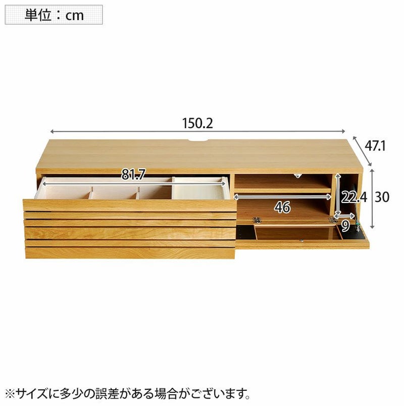 | サイズ | 外寸 / 幅1502×奥行471×高さ300mm 引き出し内部小箱 / 幅240×奥行324×高さ45mm 巾木よけ / 奥行12×高さ80mm |
