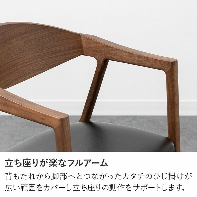 背もたれから脚部へとつながったカタチのひじ掛けが、広い範囲をカバーし立ち座りの動作をサポートします。