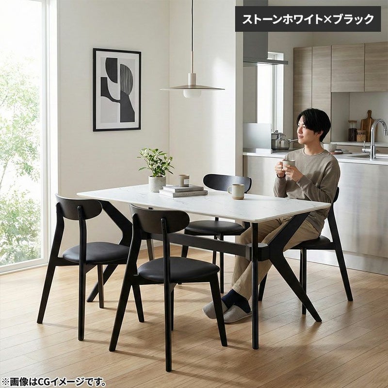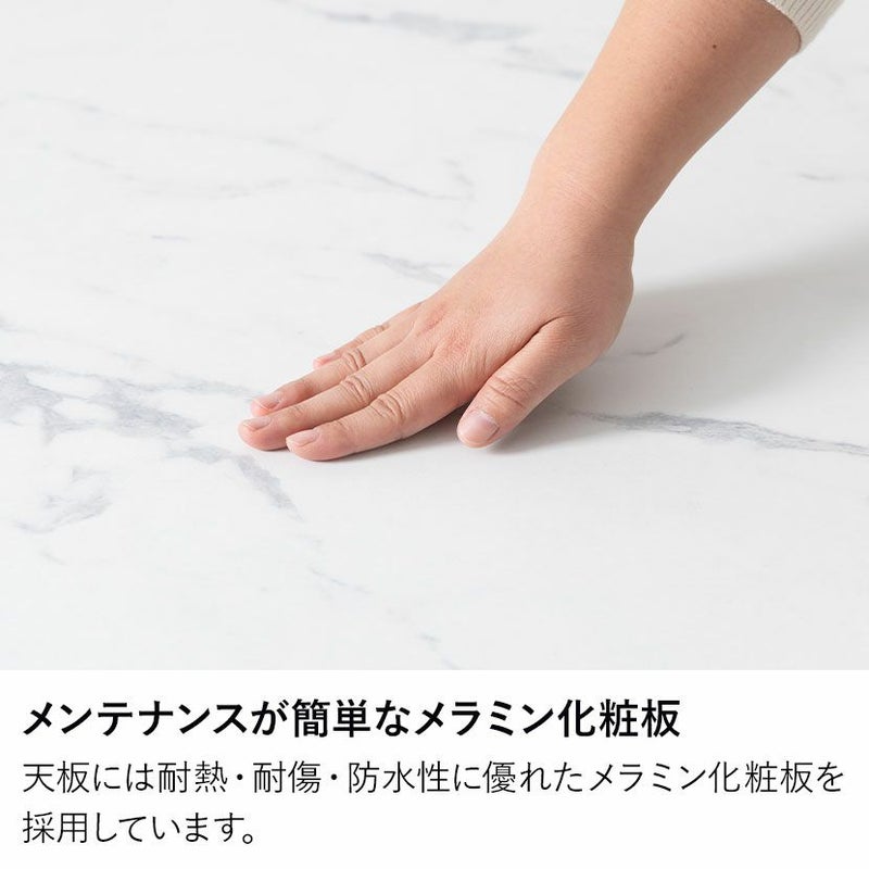 天板は見た目の美しさだけでなく、ダイニングテーブルとしての「機能性」にもこだわっています。メラミン化粧板を使用しているため熱・キズ・水に強く、長く新品のような状態を保てます。