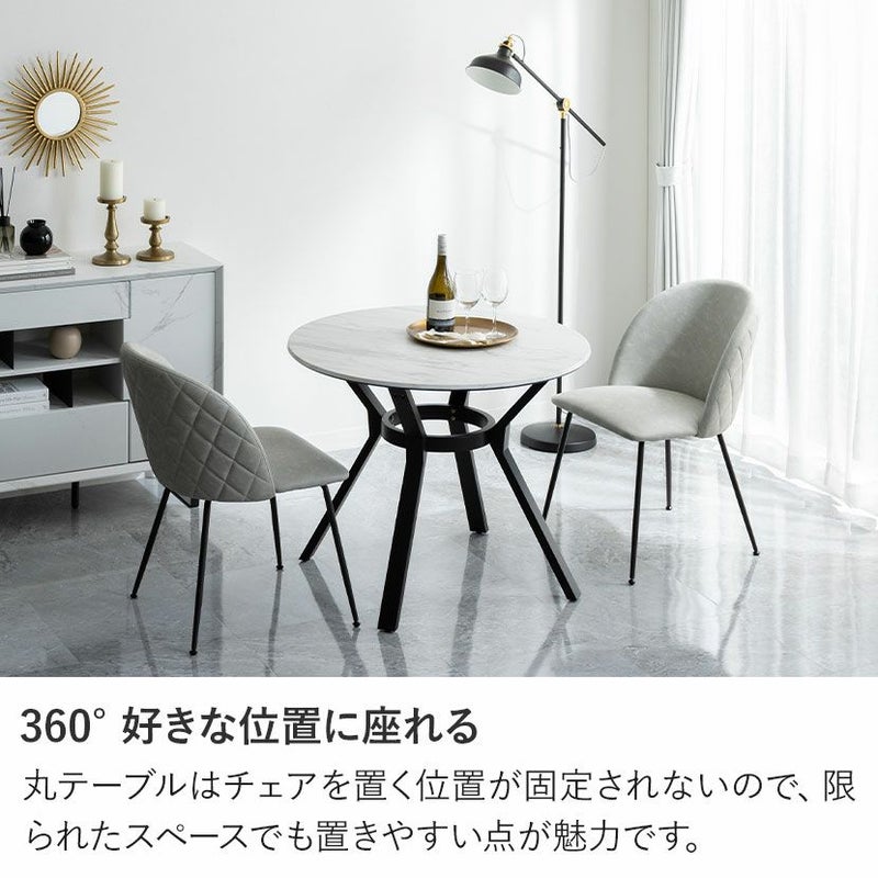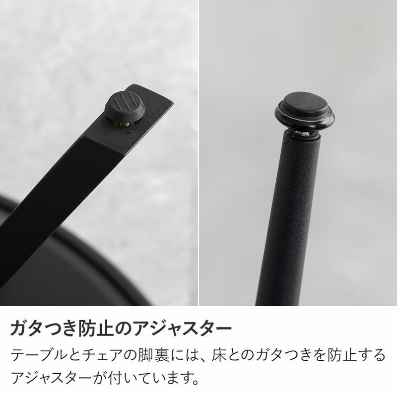 ●360°好きな位置に座れる丸テーブルはチェアを置く位置が固定されないので、限られたスペースでも置きやすい点が魅力です。●メラミナイト天板メラミンを高密度の繊維板に特殊工法で圧着させた、通常のメラミンよりも硬く、セラミックよりも軽い素材です。●メラミナイトの特徴 耐水性温湿度変化による収縮・膨張が少なく、高い寸法安定性を保持。水滴が染みこみません。●メラミナイトの特徴 耐汚性洗剤やコーヒーなどを1時間放置しても移染変化はありません。アルコール除菌も◎●メラミナイトの特徴 耐熱性180℃までの温度では変形、隆起、ひび割れなどの変化はありません。●メラミナイトの特徴 耐衝撃性強い力や衝撃を与えても目に見える損傷は見られません。●メラミナイトの特徴 耐摩耗性まな板の使用や陶器の食器類を引きずっても大丈夫です。●メラミナイトの特徴 耐紫外線色褪せにくく、長期にわたってお使いいただけます。●メラミナイトの特徴耐剥離性天板全体を圧着溶着する製造工程のため、一般的なメラミンテーブルと比べて耐剥離性に優れています。●メラミナイトの特徴 高密度通常の繊維版より内部密度が高いです。●二層構造の天板天板は高圧化粧繊維板とラバーウッド無垢材を張り合わせた二層構造になっています。●強度もデザイン性も抜群個性的な4本脚はスタイリッシュな印象を与えつつ、通常の2本脚よりも強度が高い設計となっています。●ガタつき防止のアジャスターテーブルの脚裏には床とのガタつきを防止するアジャスターが付いています。