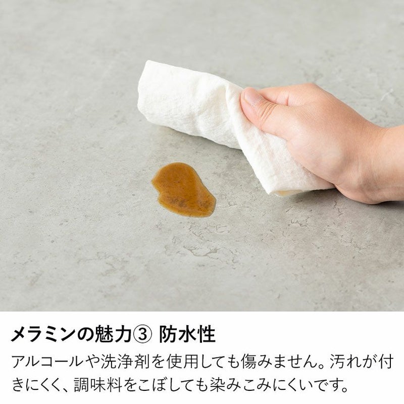 モルタル調の天板には耐久性・耐熱性に優れたメラミンを使用。汚れても簡単に拭き取れ、お手入れも簡単です。