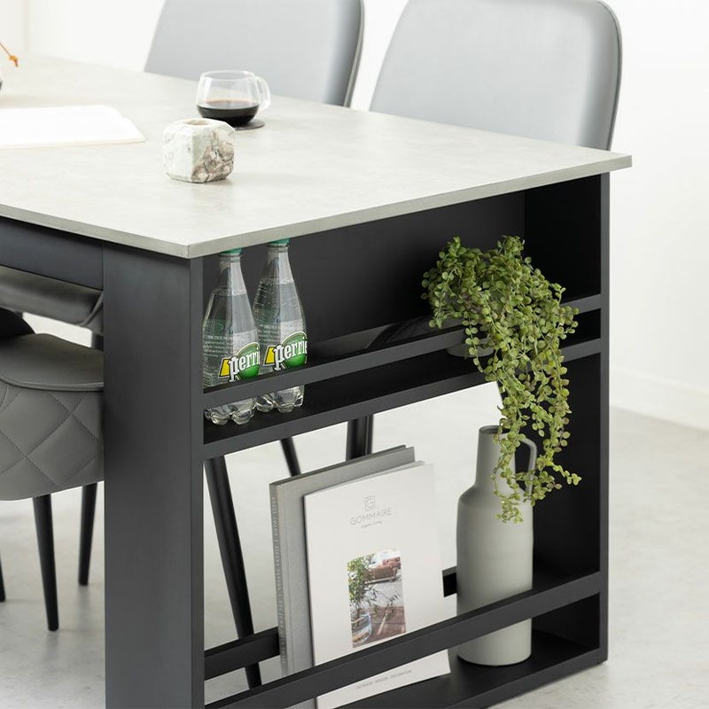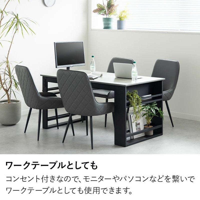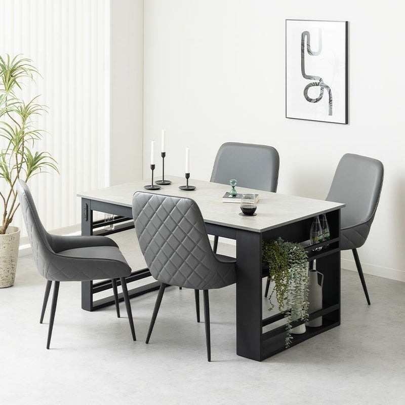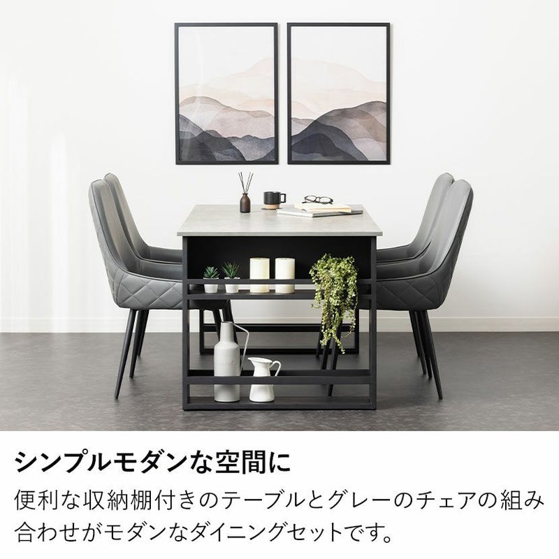 便利な収納棚付きのテーブルとグレーのチェアの組み合わせがモダンなダイニングセットです。