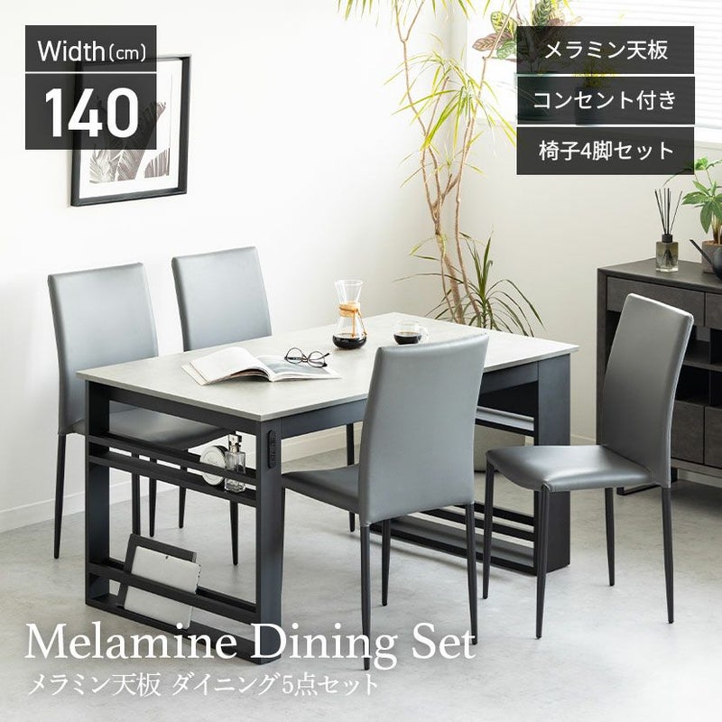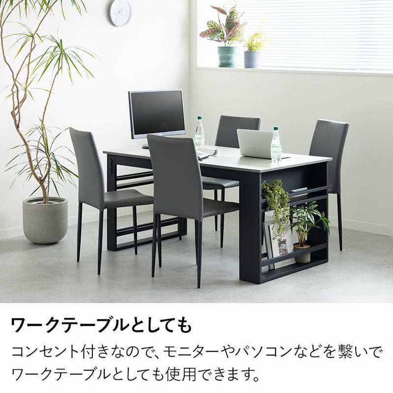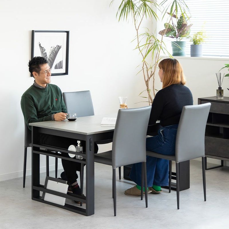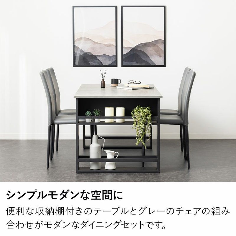 便利な収納棚付きのテーブルとグレーのチェアの組み合わせがモダンなダイニングセットです。
