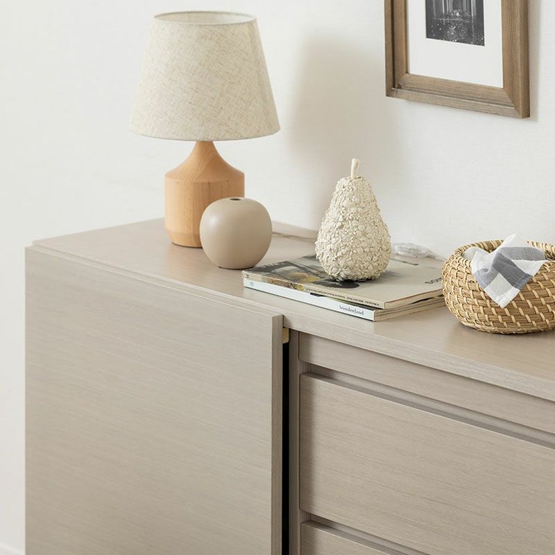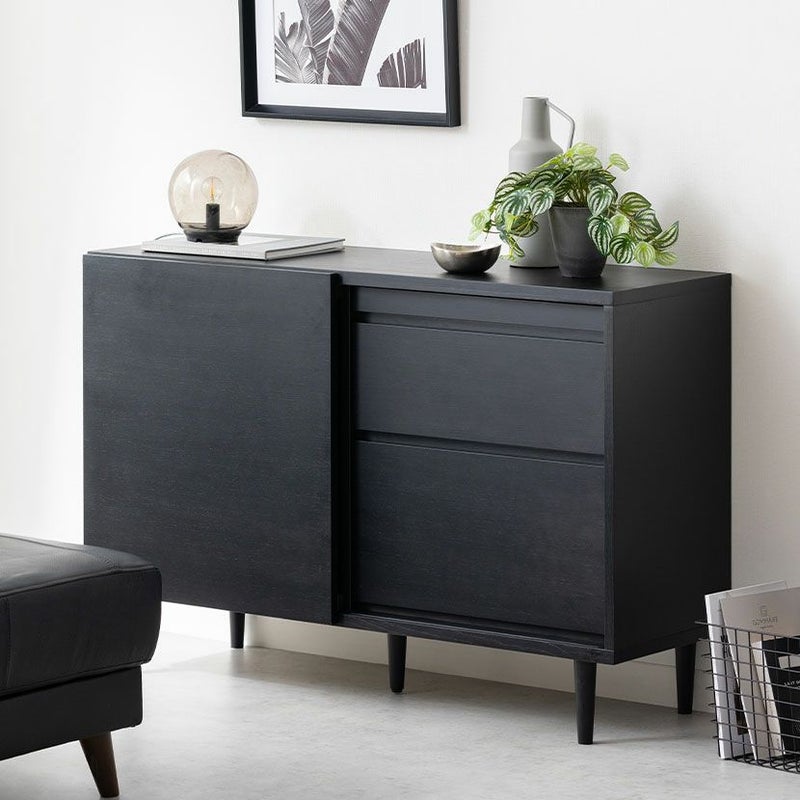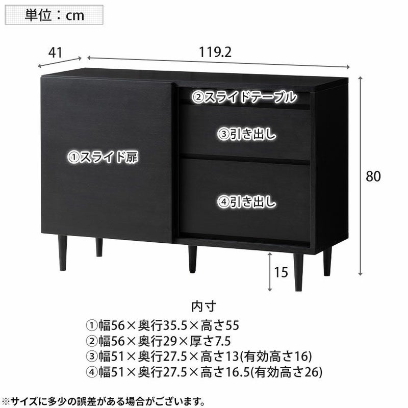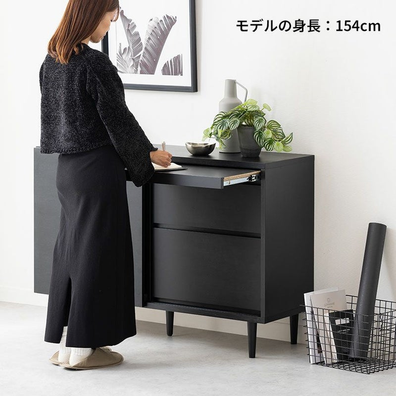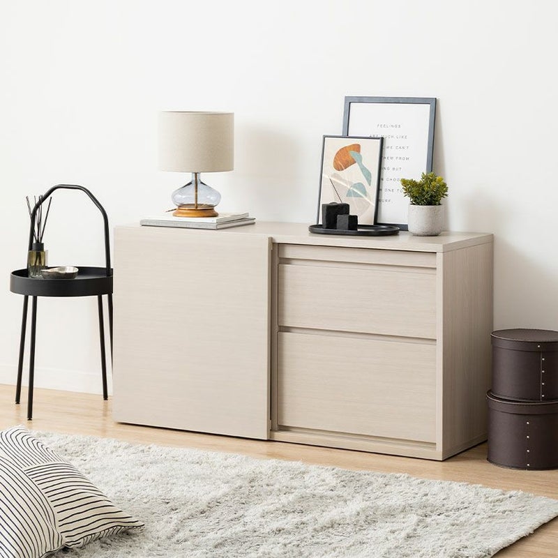 2段の引き出しは、それぞれ高さの異なるリビングやダイニング周りの小物を収納するのに適しています。