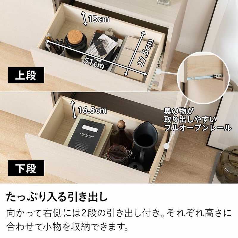引き出しにはフルスライドレールを採用しており、奥までしっかりと引き出せるため、物の出し入れがスムーズです。