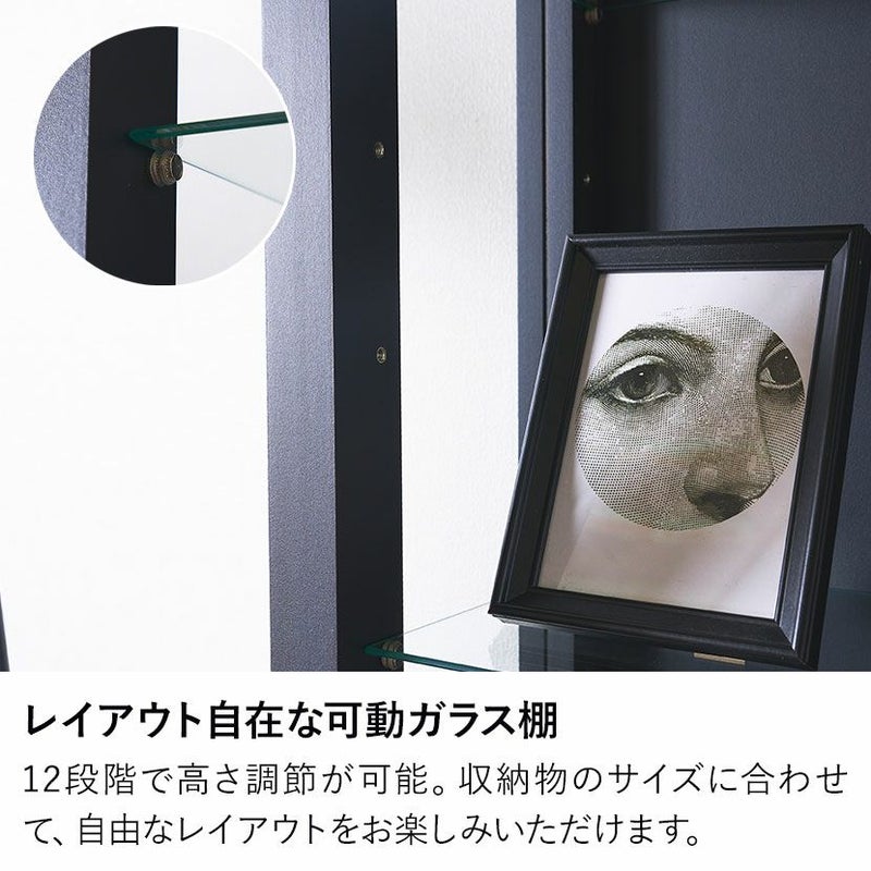 ガラス棚板は4枚付属しており、9.6cmピッチで12段階の高さ調節が可能です。