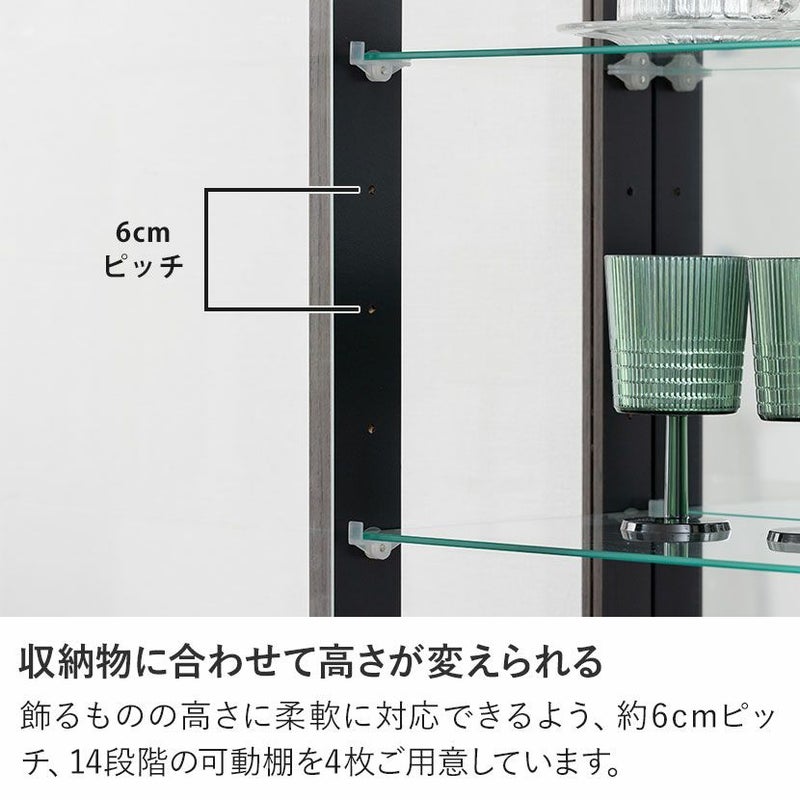 飾るものの高さに柔軟に対応できるよう、約6cmピッチ、14段階の可動棚を4枚ご用意しています。