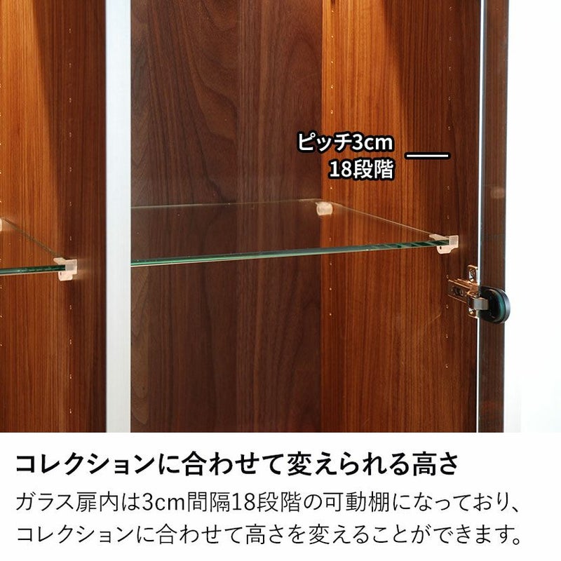 ガラス扉内は3cm間隔18段階の可動棚になっており、コレクションに合わせて高さを変えることができます。