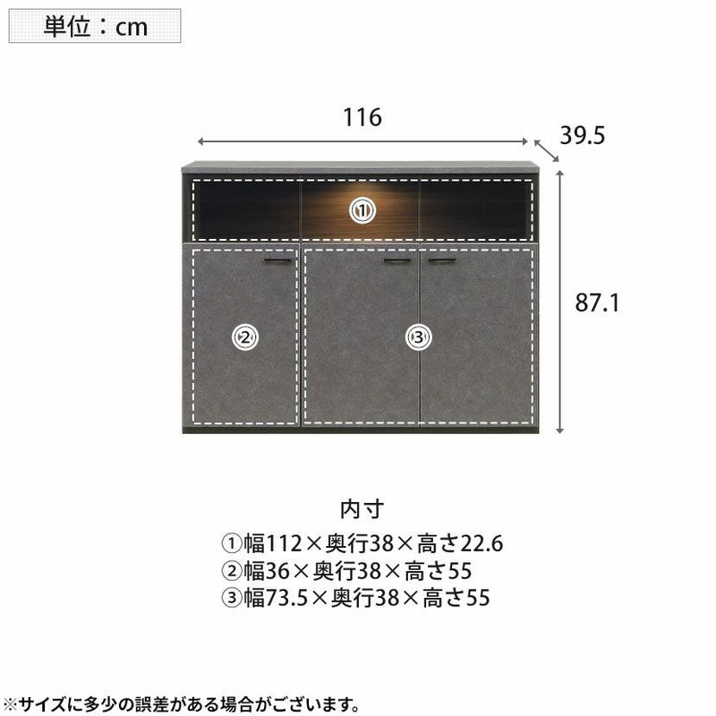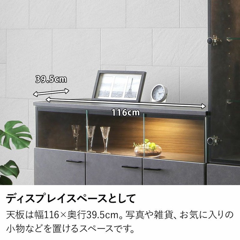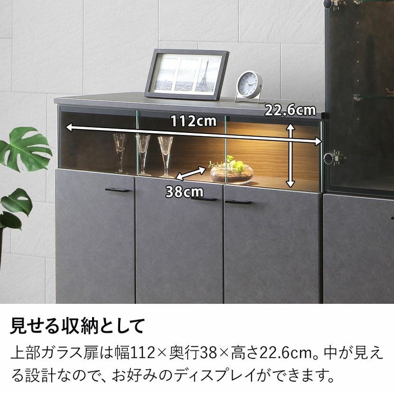 上部ガラス扉は幅112×奥行38×高さ22.6cm。中が見える設計なので、お好みのディスプレイができます。