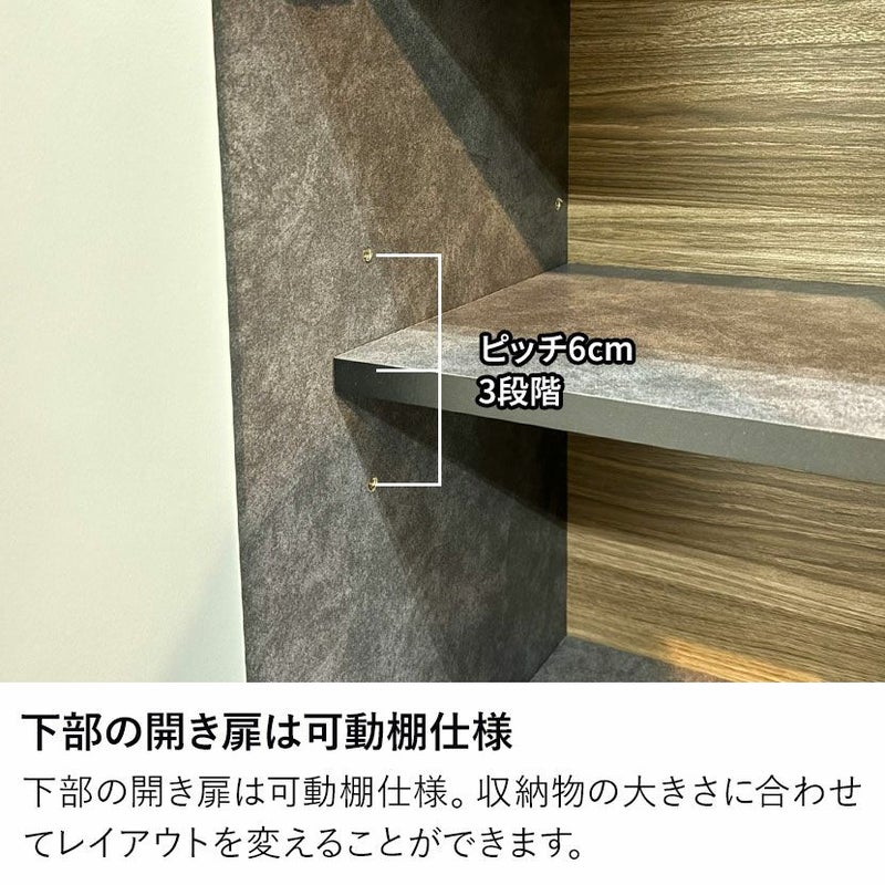 下部の開き扉は可動棚仕様。収納物の大きさに合わせてレイアウトを変えることができます。