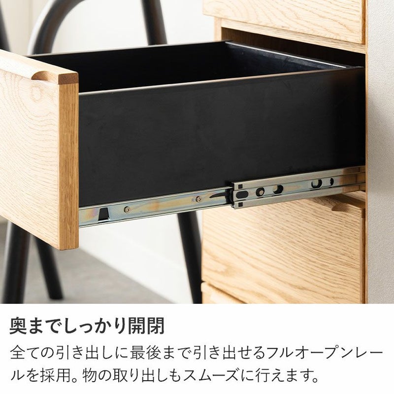 全ての引き出しに最後まで引き出せるフルオープンレールを採用。物の取り出しもスムーズに行えます。