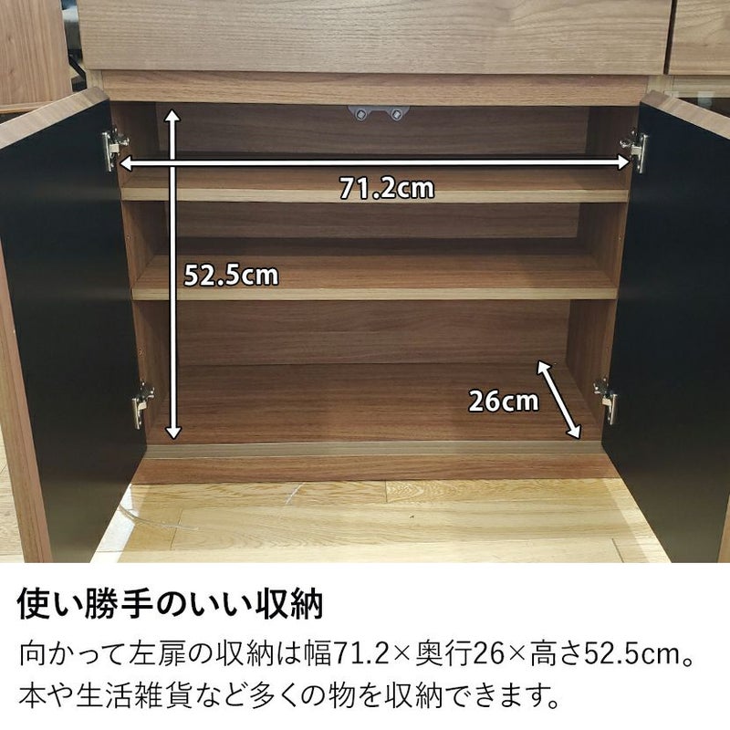 向かって左扉の収納は幅71.2×奥行26×高さ52.5cm。