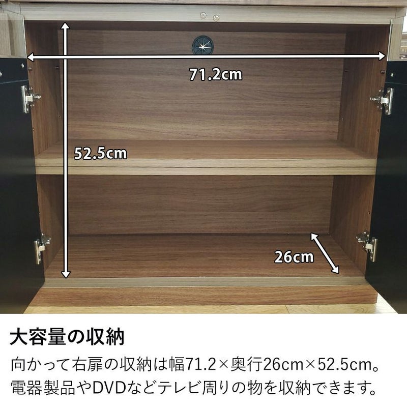 向かって右扉の収納は幅71.2×奥行26cm×52.5cm。