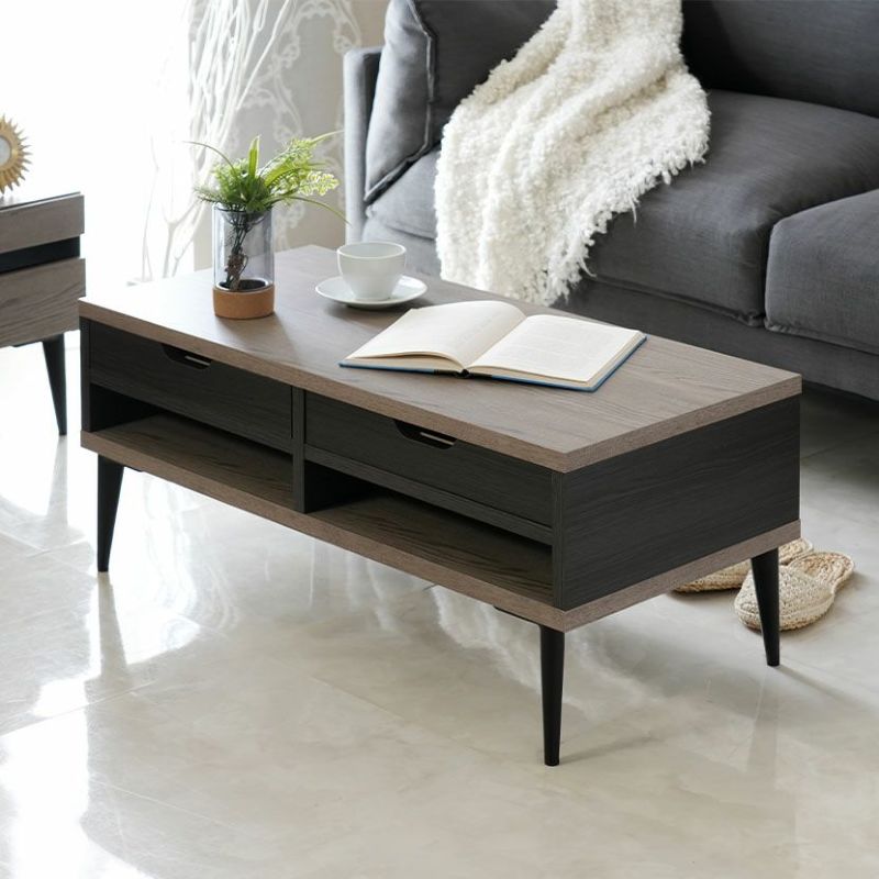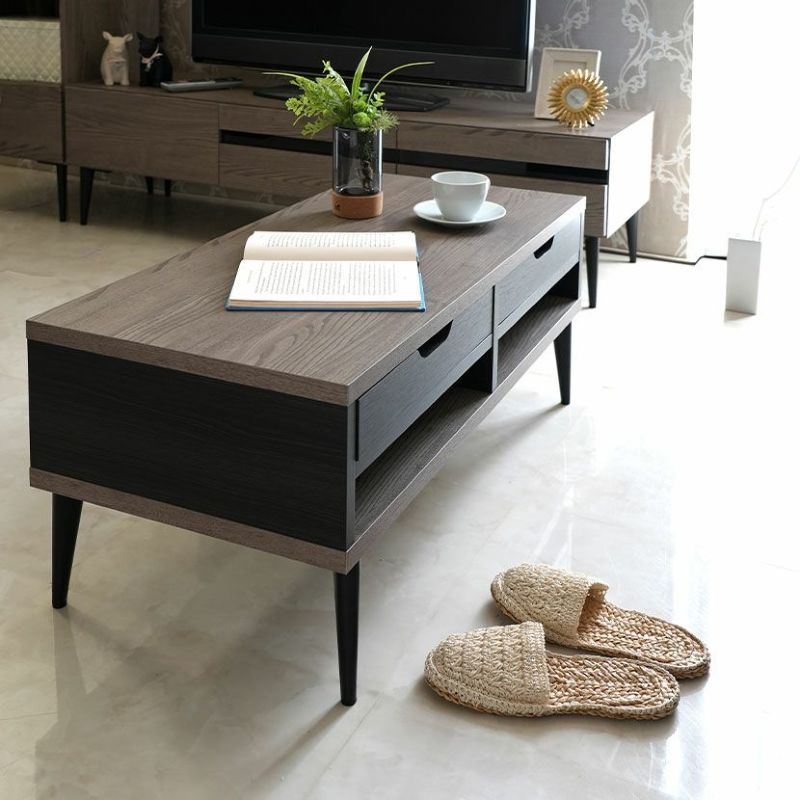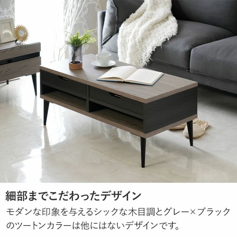 細部までこだわったデザインモダンな印象を与えるシックな木目調とグレー×ブラックのツートンカラーは他にはないデザインです。お部屋のインテリアと馴染む木目調シートどんなテイストにも馴染みやすい木目調の表面シートはシンプルだからこそ飽きのこないデザインです。シリーズで合わせ買いも同シリーズの家具と合わせることでお部屋の統一感が上がりワンランク上のインテリアを楽しめます。両側から出し入れ可能浅型の引き出しが2杯付属しています。前後どちらからでも引き出すことができるので便利です。自由に組み換え引き出しは4箇所に設置可能で、自分好みのレイアウトがお楽しみいただけます。指がかかりやすく出し入れ簡単引き出しには出し入れがしやすいよう、両側に手がかり加工を施しました。使い勝手のいいオープンスペース引き出しがないオープンスペースはリモコンや読みかけの雑誌などをすぐに取り出せる便利なスペースです。モダンな印象を与えるデザイン脚部は先に向かって細くなるテーパードレッグ。すっきりとしたシルエットの美しい脚です。収納スペースとしても脚高7cmなのでテーブル下にちょっとした収納スペースとしてご活用いただけます。