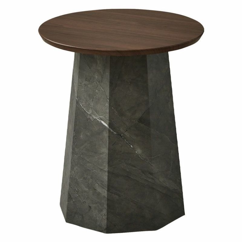 木目調の天板とマーブル柄の脚がMIXされたサイドテーブル。モニュメントのようなデザインが特徴的です。
