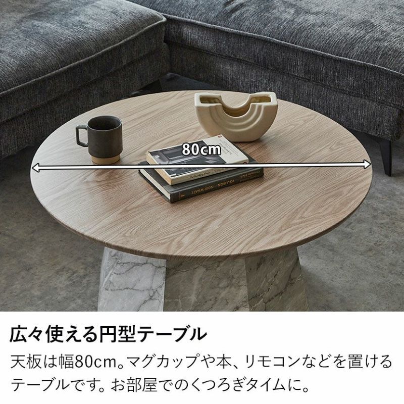 木目調の天板とマーブル柄の脚がMIXされたセンターテーブル。モニュメントのようなデザインが特徴的です。