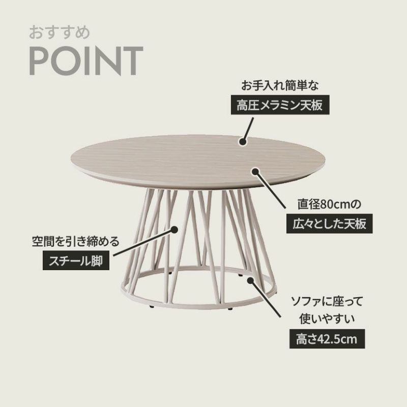 細身のスチール脚が、円形天板のやわらかな印象を引き締め、モダンな雰囲気を演出します。