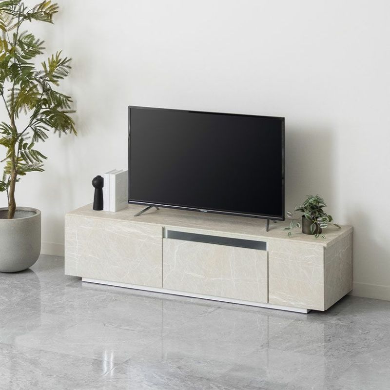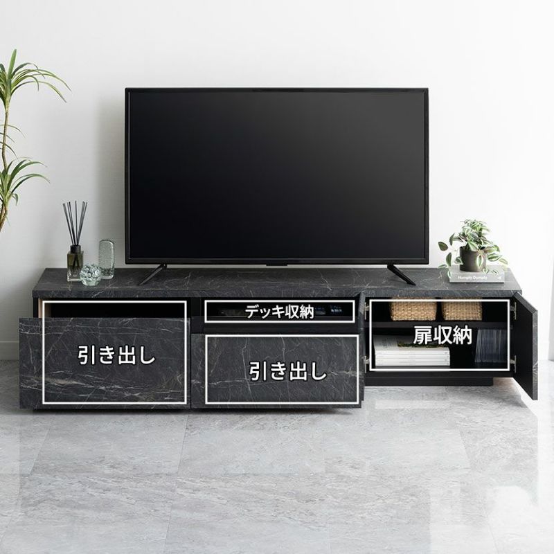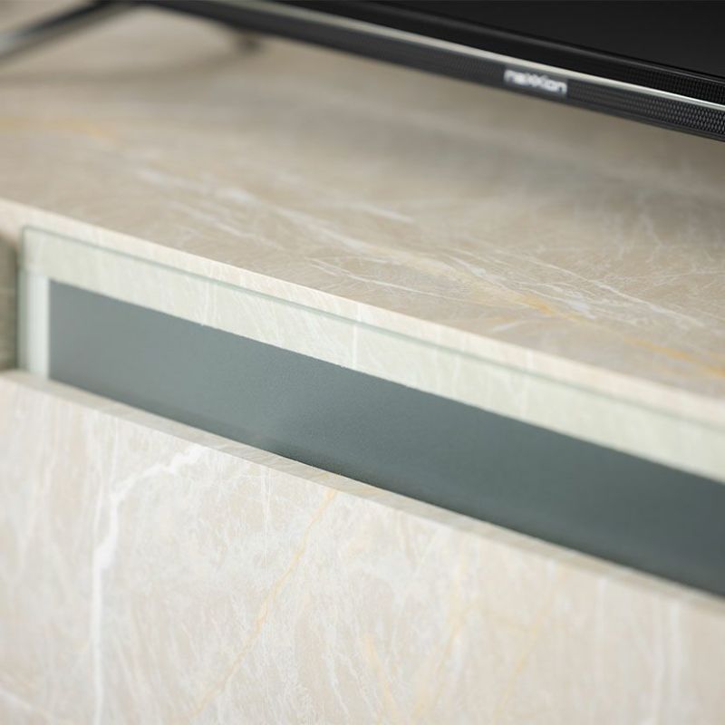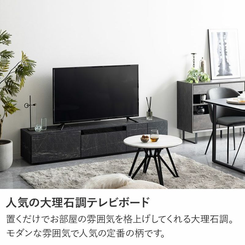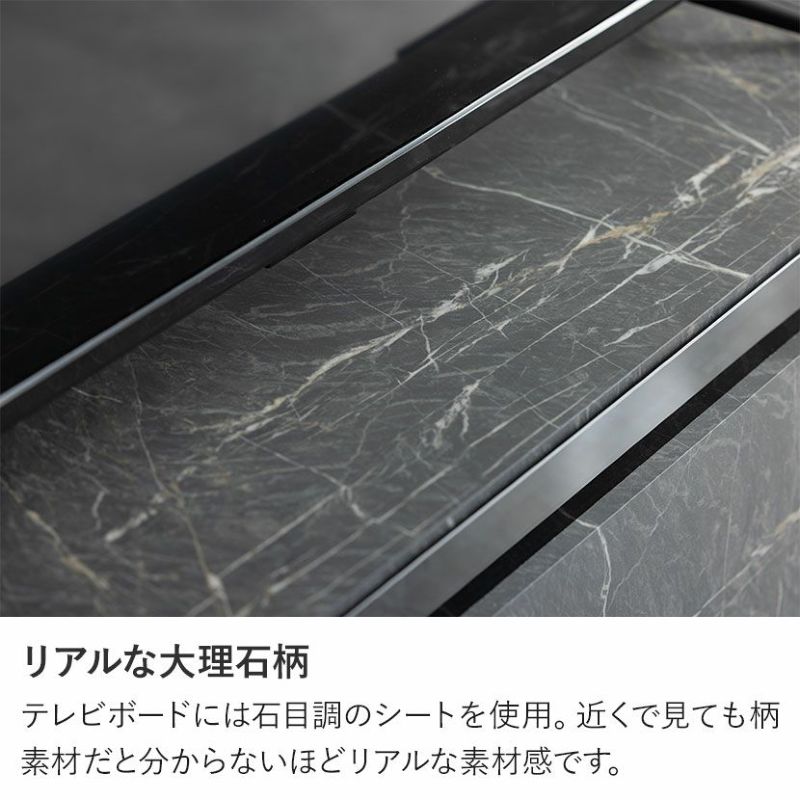 テレビボードには石目調のシートを使用。近くで見ても柄素材だと分からないほどリアルな素材感です。