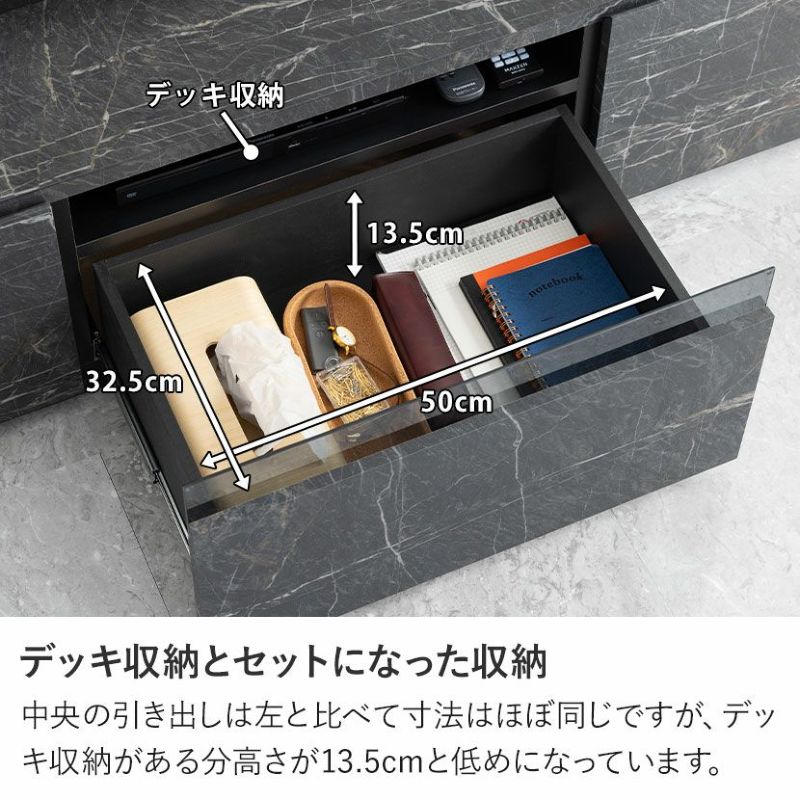 中央の引き出しは左と比べて寸法はほぼ同じですが、デッキ収納がある分高さが13.5cmと低めになっています。
