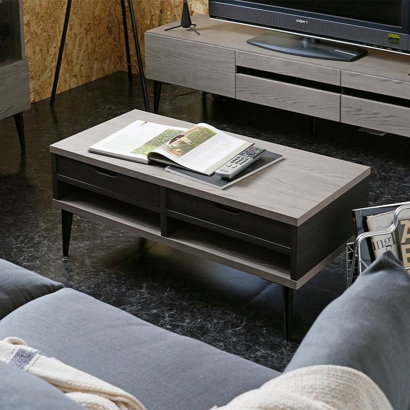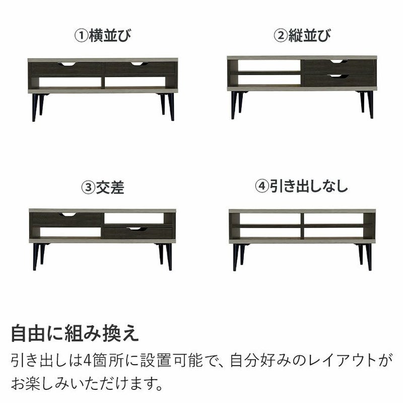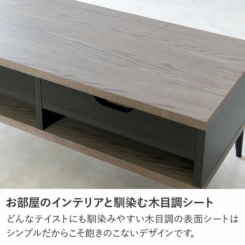 細部までこだわったデザインモダンな印象を与えるシックな木目調とグレー×ブラックのツートンカラーは他にはないデザインです。お部屋のインテリアと馴染む木目調シートどんなテイストにも馴染みやすい木目調の表面シートはシンプルだからこそ飽きのこないデザインです。シリーズで合わせ買いも同シリーズの家具と合わせることでお部屋の統一感が上がりワンランク上のインテリアを楽しめます。両側から出し入れ可能浅型の引き出しが2杯付属しています。前後どちらからでも引き出すことができるので便利です。自由に組み換え引き出しは4箇所に設置可能で、自分好みのレイアウトがお楽しみいただけます。指がかかりやすく出し入れ簡単引き出しには出し入れがしやすいよう、両側に手がかり加工を施しました。使い勝手のいいオープンスペース引き出しがないオープンスペースはリモコンや読みかけの雑誌などをすぐに取り出せる便利なスペースです。モダンな印象を与えるデザイン脚部は先に向かって細くなるテーパードレッグ。すっきりとしたシルエットの美しい脚です。収納スペースとしても脚高7cmなのでテーブル下にちょっとした収納スペースとしてご活用いただけます。