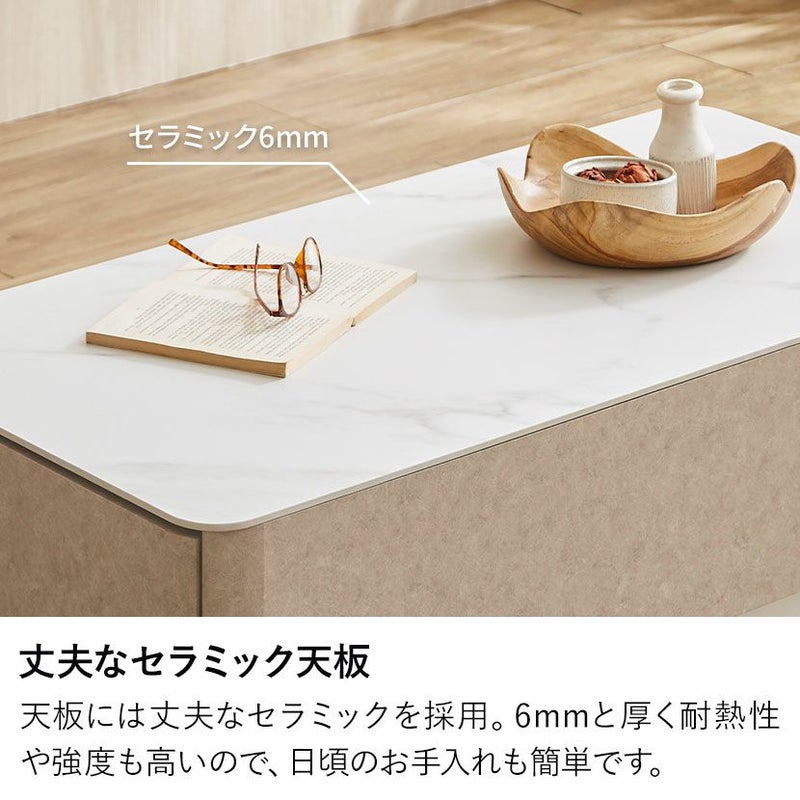 天板には丈夫なセラミックを採用。6mmと厚く耐熱性や強度も高いので、日頃のお手入れも簡単です。