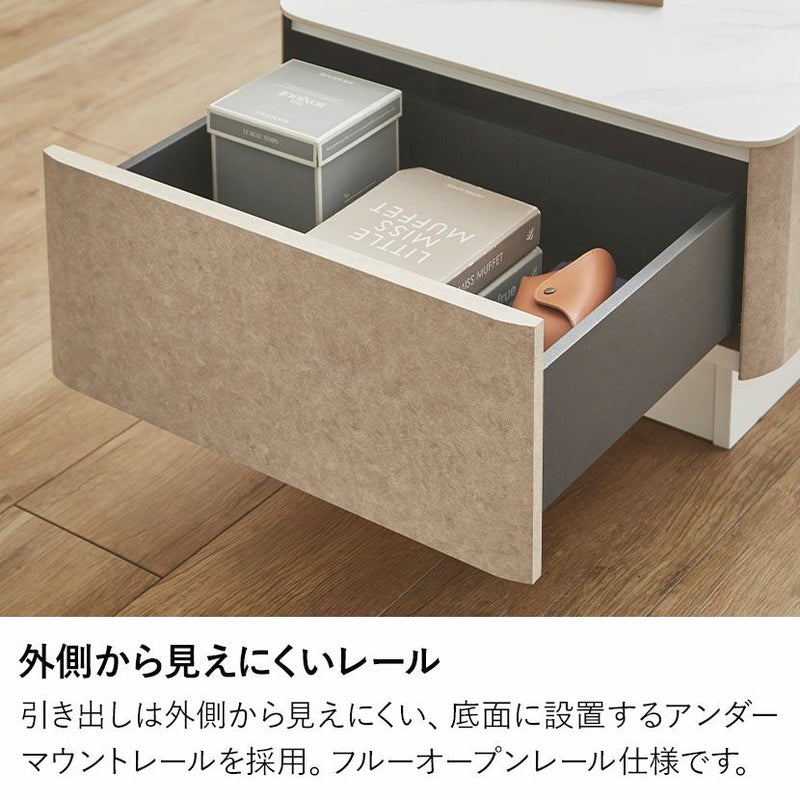 引き出しはゆっくり閉まるソフトクローズ仕様。開閉時の振動が少なく、収納物を大切に保管します。