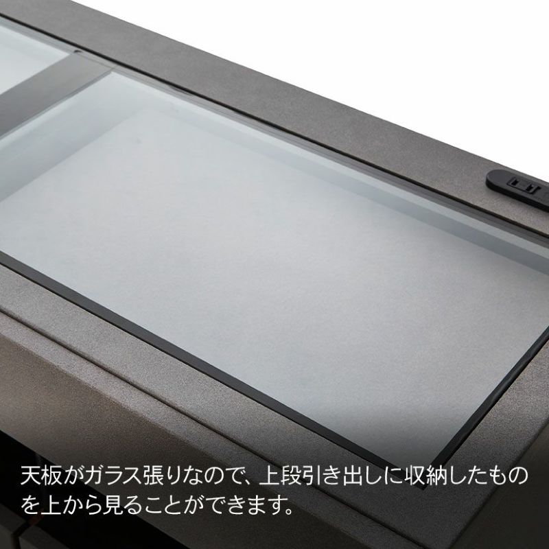 天板がガラス張りなので、上段引き出しに収納したものを上から見ることができます。