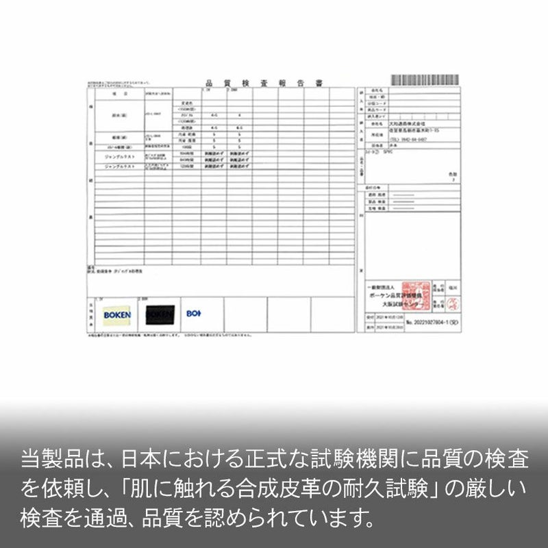 湿気に弱い合成皮革は、下地と表面樹脂の間に湿気が入ると、加水分解を起こして剥離の原因になります。当製品は、日本における正式な試験機関に品質の検査を依頼し、「肌に触れる合成皮革の耐久試験」の厳しい検査を通過、品質を認められています。