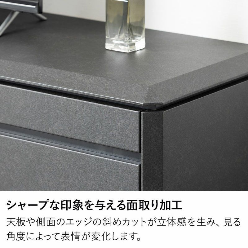 天板のエッジには斜めのカット(面取り加工)を施しており、立体感を生むため、見る角度によって本体の表情が変化し、シャープな印象を与えます。