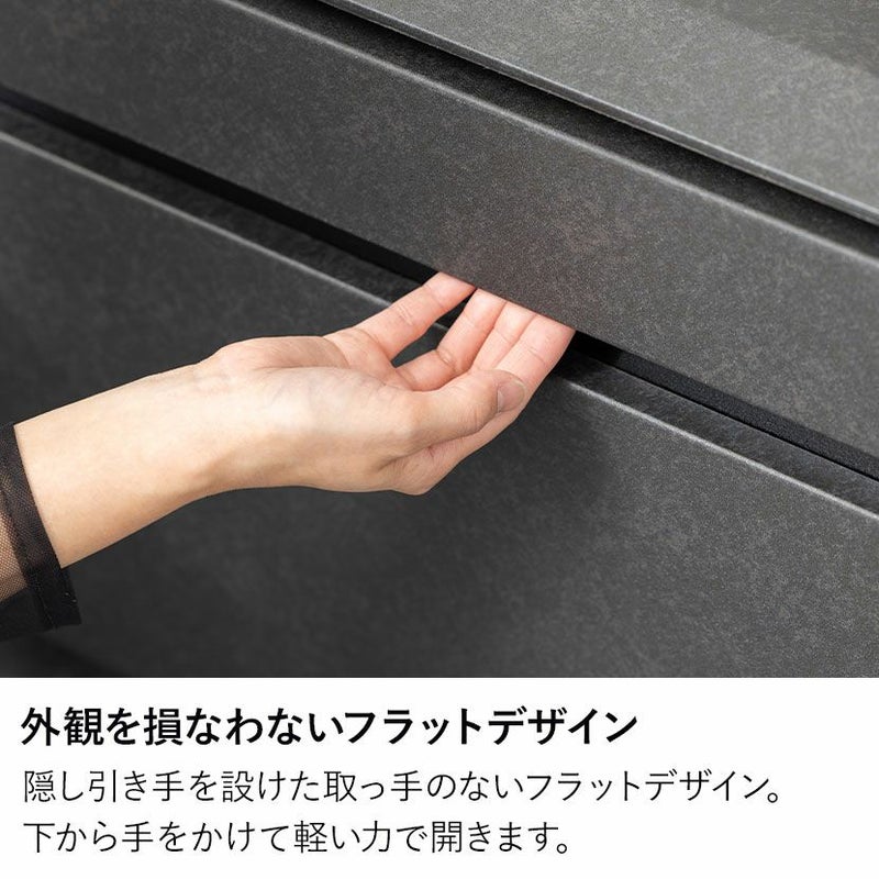 取っ手のないフラットデザインを採用し、下部に隠し引き手を設けています。下から手をかけて軽い力で簡単に開くことができます。