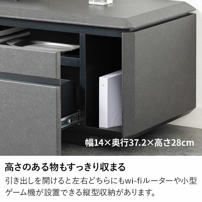 大容量の大型引き出しを2杯搭載しています。ルーターなどの高さのある小物も収まる便利な縦型収納も付いています。