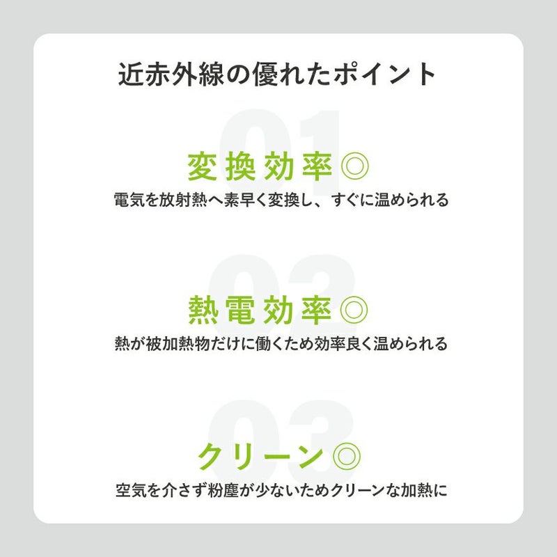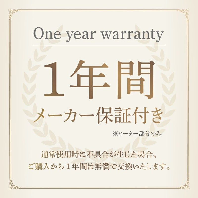 | 保証について | 1年間のメーカー保証をお付けしております。(ヒーター部分のみ) 正常な使用状態において不具合が起きた場合、無償で交換いたします。 ※詳しくは製品に同梱されるメーカー保証書をご確認ください。 |