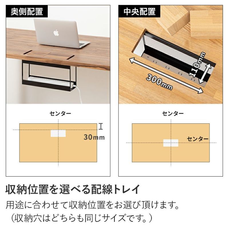 ミニマルな設計でおしゃれな蓋つきの配線トレイ。中央と奥側で位置をお選び頂けます。