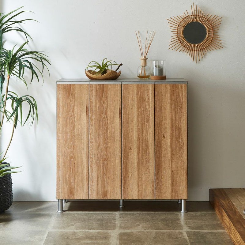 異素材の組み合わせがモダンな雰囲気を演出し、玄関収納家具として落ち着いた空間を演出します。
