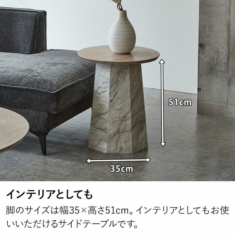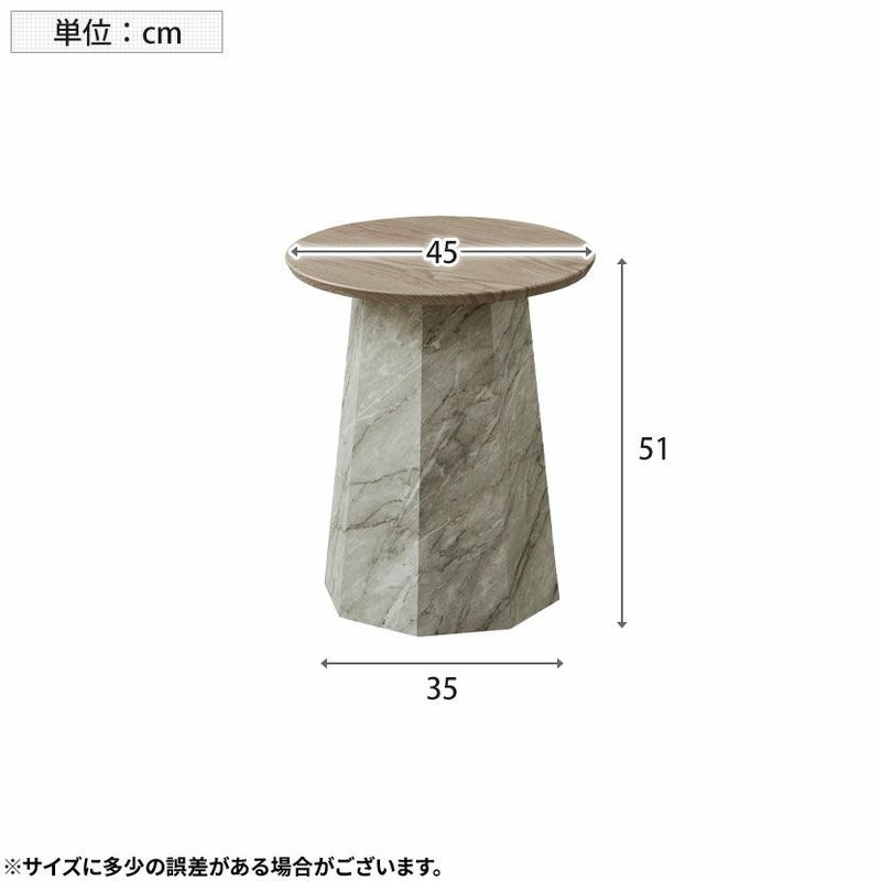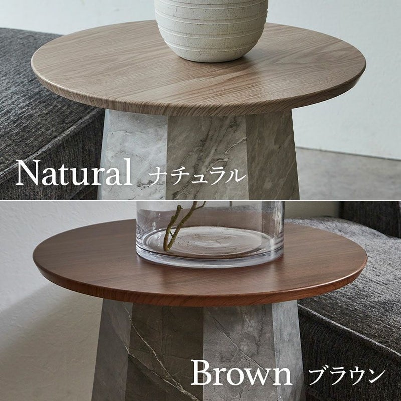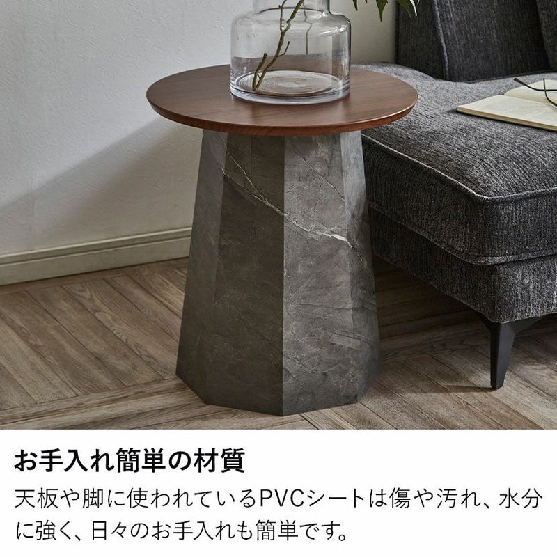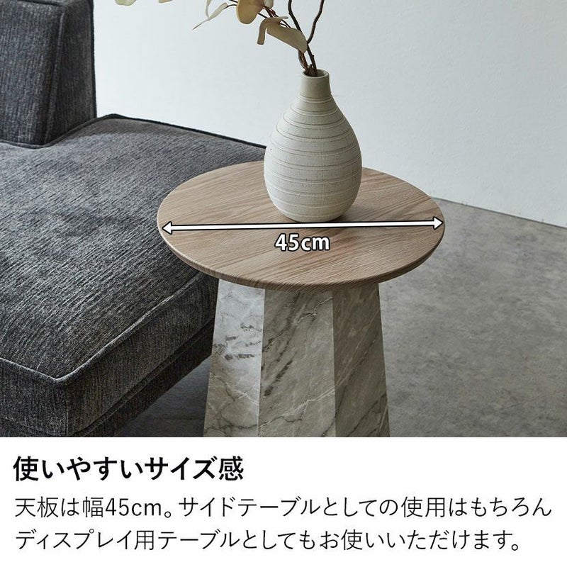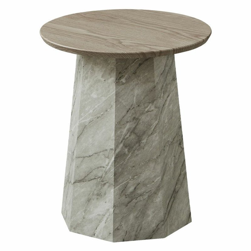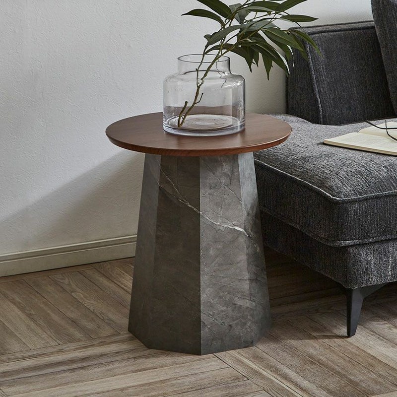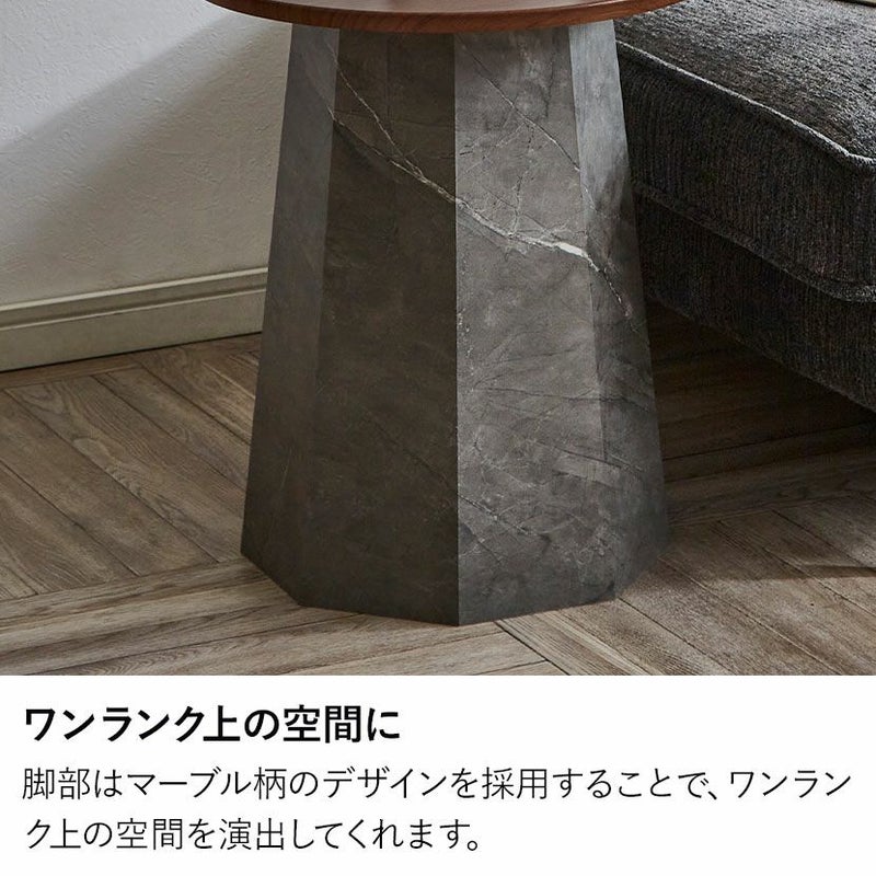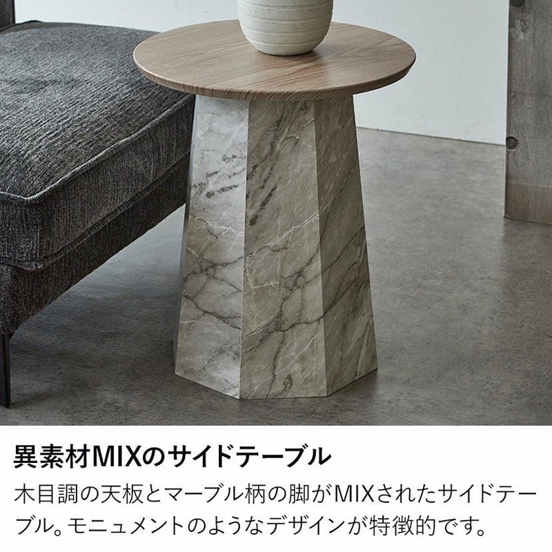木目調の天板とマーブル柄の脚がMIXされたサイドテーブル。モニュメントのようなデザインが特徴的です。