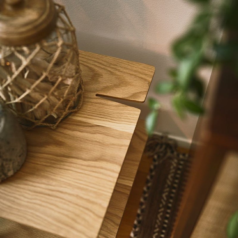 アクセントして、木材の欠けを思わせる切り込みを入れています。シンプルでありながら個性を感じるデザインです。
