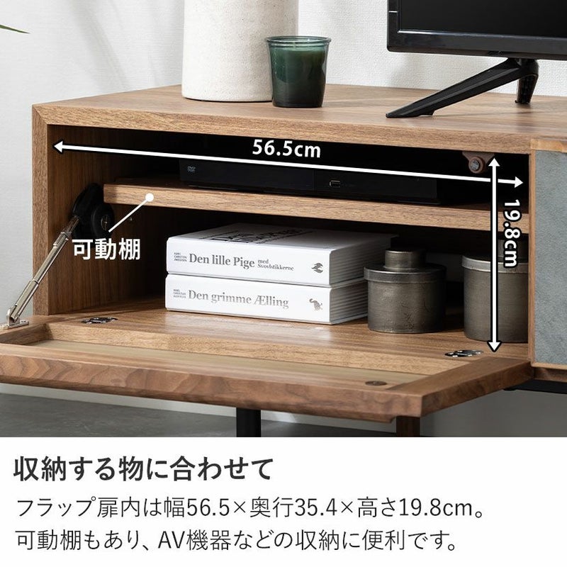 フラップ扉内は幅56.5×奥行35.4×高さ19.8cm。可動棚もあり、AV機器などの収納に便利です。