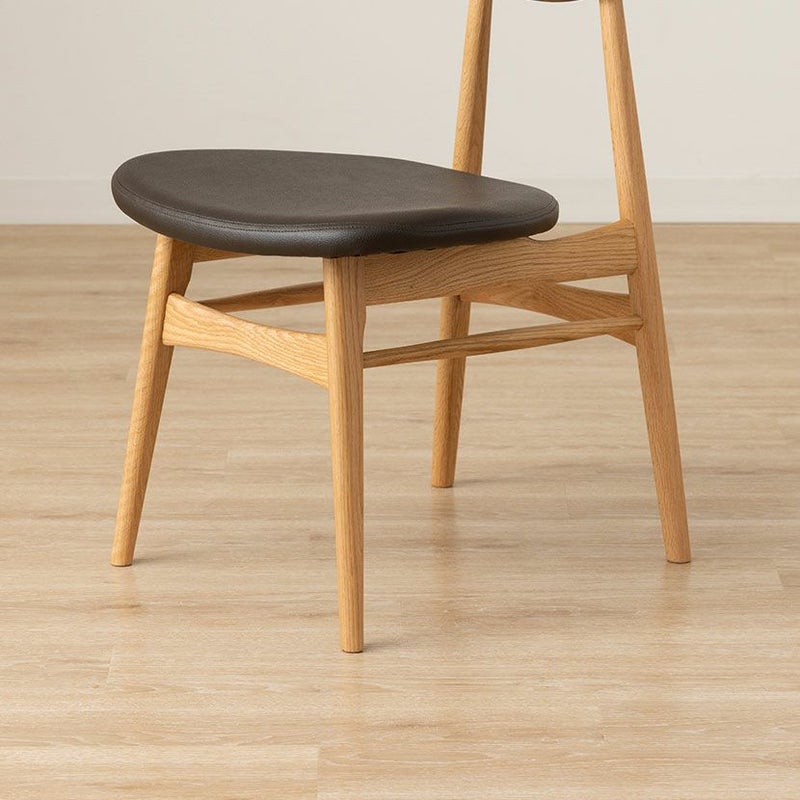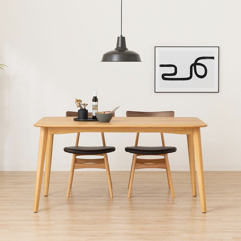 高級感溢れる天然木ダイニングセット滑らかであたたかみのある天然木ダイニング。優しい手触りが日々の暮らしの中心になる1台です。●オーク天然木を使用した美しい天板節や白太など、木本来の表情を活かしているので、この世にひとつとして同じものは存在しません。●木の質感を損なわないウレタン塗装人体に有害なトルエン・キシレンが発生しない安心な塗料を使用しているため、安心してお使いいただけます。●反り防止板天板の反りを防ぐために、天板裏には反り止め板を取り付けています。●優しく滑らかな角の処理天板のフチは角が出ないように加工を施し、優しい手触りに仕上げています。●天板をしっかり支える4本脚脚は天板のフォルムに合う丸みを持たせ、安定感のあるハの字脚構造になっています。●ガタつき防止のアジャスター床面との調節ができ、多少凹凸のある場所でも水平に設置できます。●天然木によるナチュラル感とあたたかみウォールナットの背もたれとオークのフレームを組み合わせたツートン仕様のダイニングチェアです。●唯一無二の模様の表情背もたれは木のあたたかみを感じるウォールナット天然木。水分や汚れに強いウレタン塗装で仕上げています。●背中に沿う絶妙な曲線背もたれは木に直接カーブをつけ、どこから見ても美しいデザインに仕上げています。●ツートンカラーウォールナット材とオーク材を組み合わせたデザインはモダンでおしゃれな空間を演出します。●適度な弾力の座り心地座面は適度な弾力のある座り心地で、座面の幅が広めなのでゆったり座ることができます。●お手入れ簡単なPVCレザー座面はPVCなので水分に強く、汚れてもサッと拭き取るだけなのでお手入れも簡単です。●体重をしっかり支えるハの字脚脚部は丸みを持った滑らかなデザインで安定感のあるハの字構造になっています。