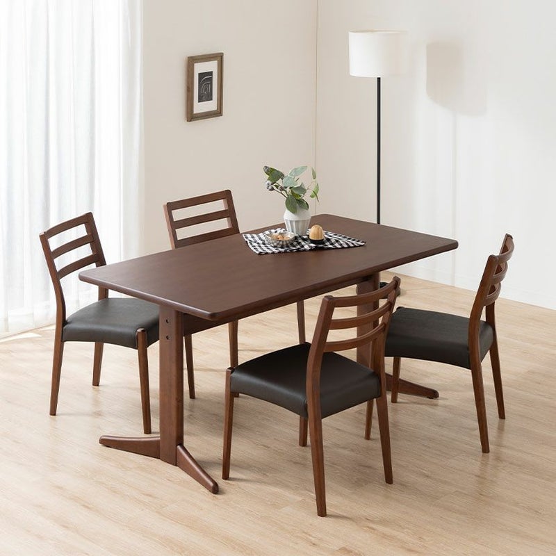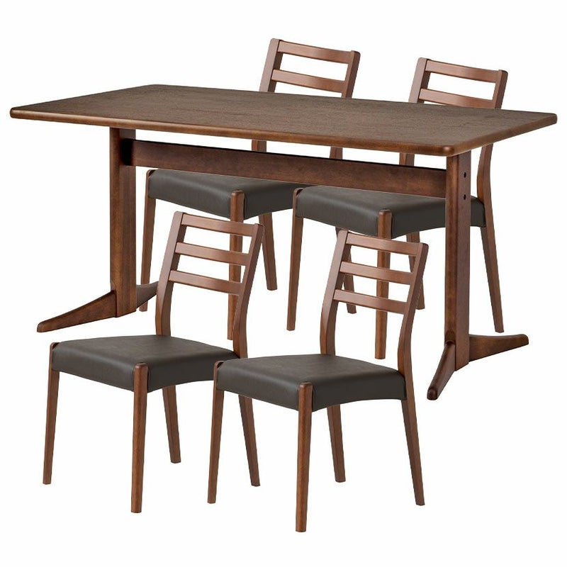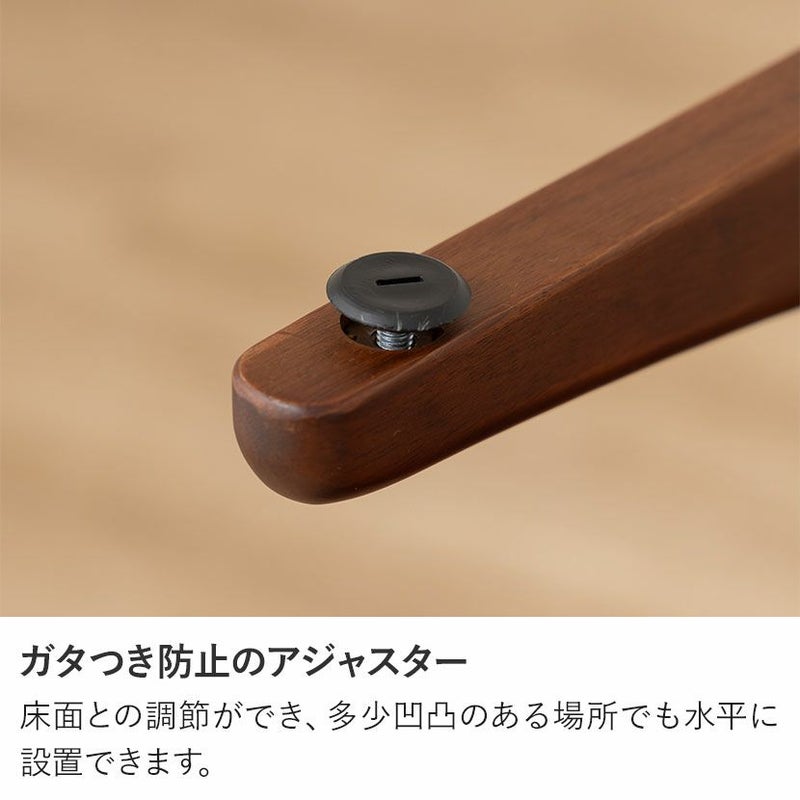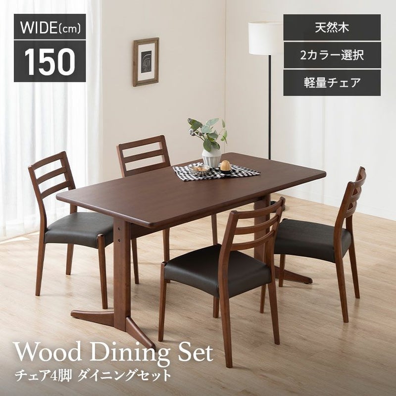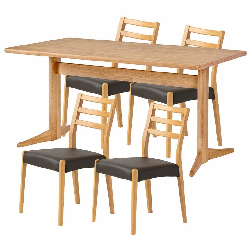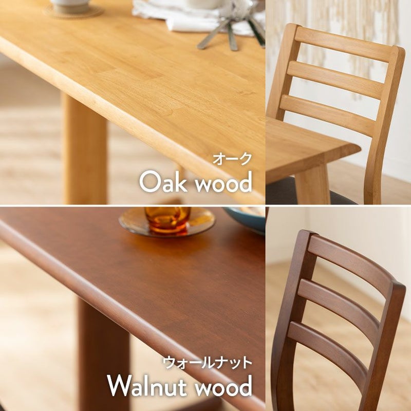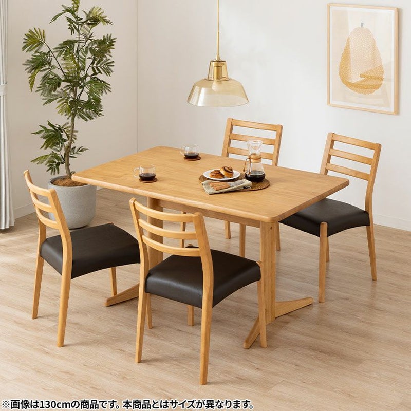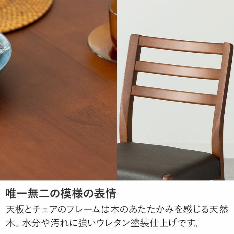 高級感溢れる天然木ダイニングセット滑らかであたたかみのある天然木ダイニング。優しい手触りが日々の暮らしの中心になる1台です。●天然木を贅沢に使用したダイニングテーブル節や白太など、木本来の表情を活かしているので、この世にひとつとして同じものは存在しません。●優しく滑らかな角の処理天板のフチは角が出ないように加工を施し、優しい手触りに仕上げています。●反り防止金具テーブル天板裏面には木材の反り防止のための金具がはめ込んであります。●2本脚で出入りもしやすく2本脚にすることで、すっきりとした見た目に加え、椅子の出し入れや足入れも楽に行えます。安定感を高める中板脚部には2本の脚を繋ぐ中板があり、強度が高まるので安定感も増します。●ガタつき防止のアジャスター床面との調節ができ、多少凸凹のある場所でも水平に設置できます。●天然木のあたたかみを感じられるチェア天然木のあたたかみ溢れるルーバーデザインチェア。ブラックの座面がデザイン全体を引き締めます。●持ち運びが簡単な軽量チェア軽量なので女性やお子様でも簡単に持ち上げられ、お掃除も楽に行えます。●軽やかなフォルムデザインチェアのフレームは木のあたたかみを感じる天然木。背面のルーバーデザインが軽やかさをプラスします。●背中に沿う絶妙な曲線背もたれは木に直接カーブをつけ、どこから見ても美しいデザインに仕上げています。●適度な弾力の座り心地座面は適度な弾力のある座り心地で、座面の幅が広めなのでゆったり座ることができます。●お手入れ簡単なPVCレザー座面はPVCなので水分に強く、汚れてもサッと拭き取るだけなのでお手入れも簡単です。