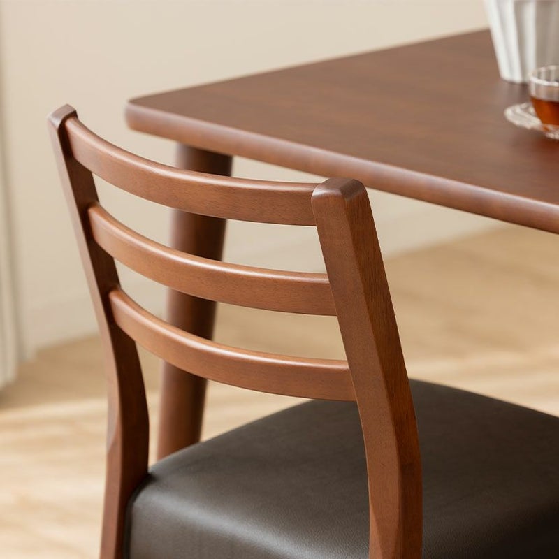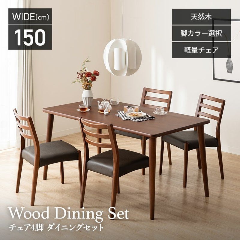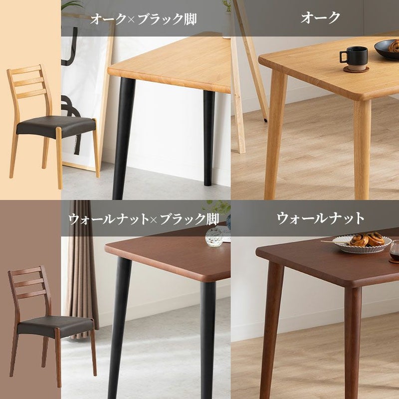 ●シンプルデザインのダイニングテーブル天板は天然木、脚にはブラックカラーも合わせられる、ナチュラルテイストなダイニングテーブルです。●天然木を贅沢に使用したダイニングテーブル節や白太など、木本来の表情を活かしているので、この世にひとつとして同じものは存在しません。●優しく滑らかな角の処理天板のフチは角が出ないように加工を施し、優しい手触りに仕上げています。●反り防止金具テーブル天板裏面には木材の反り防止のための金具がはめ込んであります。●天板をしっかり支える4本脚脚は天板のフォルムに合う丸みを持たせ、安定感のある?の字脚構造になっています。●選べる脚脚は左からブラック、オーク、ウォールナットの3種類。お部屋の雰囲気に合わせてお選びいただけます。●ガタつき防止のアジャスター床面との調節ができ、多少凸凹のある場所でも水平に設置できます。●天然木のあたたかみを感じられるチェア天然木のあたたかみ溢れるルーバーデザインチェア。ブラックの座面がデザイン全体を引き締めます。●持ち運びが簡単な軽量チェア軽量なので女性やお子様でも簡単に持ち上げられ、お掃除も楽に行えます。●軽やかなフォルムデザインチェアのフレームは木のあたたかみを感じる天然木。背面のルーバーデザインが軽やかさをプラスします。●背中に沿う絶妙な曲線背もたれは木に直接カーブをつけ、どこから見ても美しいデザインに仕上げています。●適度な弾力の座り心地座面は適度な弾力のある座り心地で、座面の幅が広めなのでゆったり座ることができます。●お手入れ簡単なPVCレザー座面はPVCなので水分に強く、汚れてもサッと拭き取るだけなのでお手入れも簡単です。