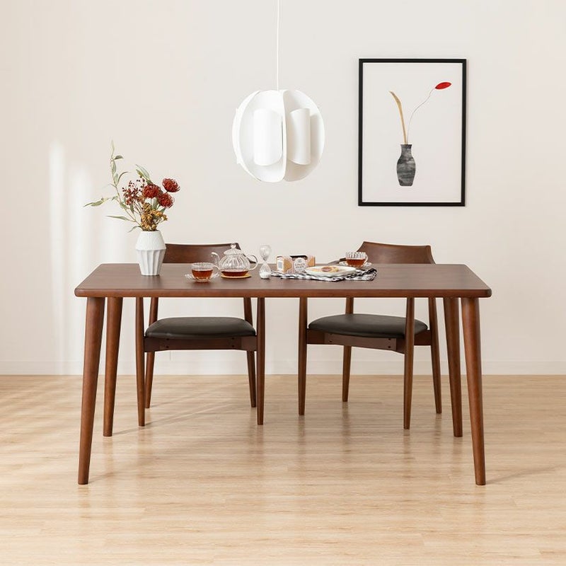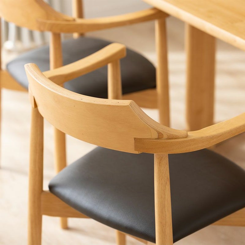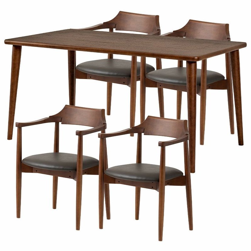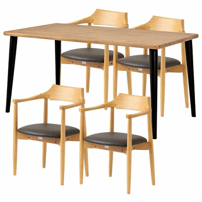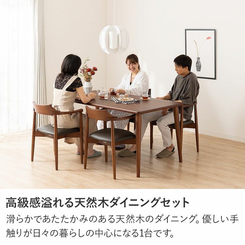高級感溢れる天然木ダイニングセット滑らかであたたかみのある天然木ダイニング。優しい手触りが日々の暮らしの中心になる1台です。●天然木を贅沢に使用したダイニングテーブル節や白太など、木本来の表情を活かしているので、この世にひとつとして同じものは存在しません。●優しく滑らかな角の処理天板のフチは角が出ないように加工を施し、優しい手触りに仕上げています。●反り防止金具テーブル天板裏面には木材の反り防止のための金具がはめ込んであります。●天板をしっかり支える4本脚脚は天板のフォルムに合う丸みを持たせ、安定感のある?の字脚構造になっています。●選べる脚脚は左からブラック、オーク、ウォールナットの3種類。お部屋の雰囲気に合わせてお選びいただけます。●ガタつき防止のアジャスター床面との調節ができ、多少凸凹のある場所でも水平に設置できます。●天然木のあたたかみを感じられるチェア弧を描いた天然木の背もたれが、主張しすぎない存在感を作り出します。●唯一無二の模様の表情チェアのフレームは木のあたたかみを感じる天然木。水分や汚れに強いウレタン塗装で仕上げています。●背中に沿う絶妙な曲線背もたれは木に直接カーブをつけ、どこから見ても美しいデザインに仕上げています。●背もたれと繋がるデザインの肘掛け背もたれからなだらかに続くアームレストは包み込むようなデザインでフィット感のある使い心地です。●適度な弾力の座り心地座面は適度な弾力のある座り心地で、座面の幅が広めなのでゆったり座ることができます。●お手入れ簡単なPVCレザー座面はPVCなので水分に強く、汚れてもサッと拭き取るだけなのでお手入れも簡単です。