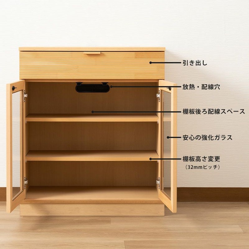 ガラス扉の内部には可動棚が2枚付いており、収納するものに合わせて高さを変更できます。(32mmピッチ)